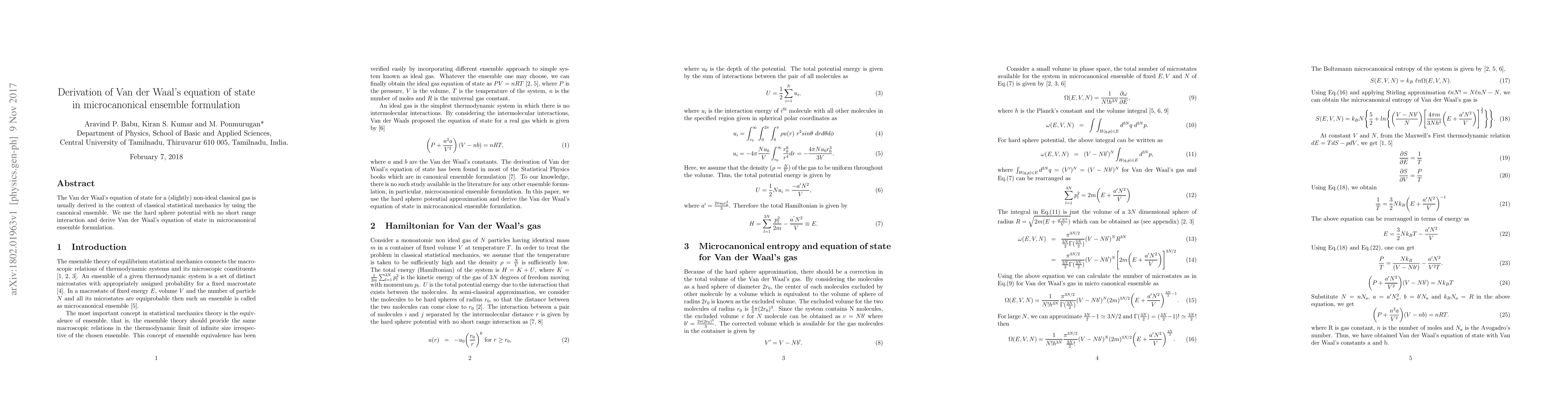 The Van der Waal's equation of state for a (slightly) non-ideal classical gas is usually derived in the context of classical statistical mechanics by using the canonical ensemble. We use the hard sphere potential with no short range interaction and derive Van der Waal's equation of state in microcanonical ensemble formulation.