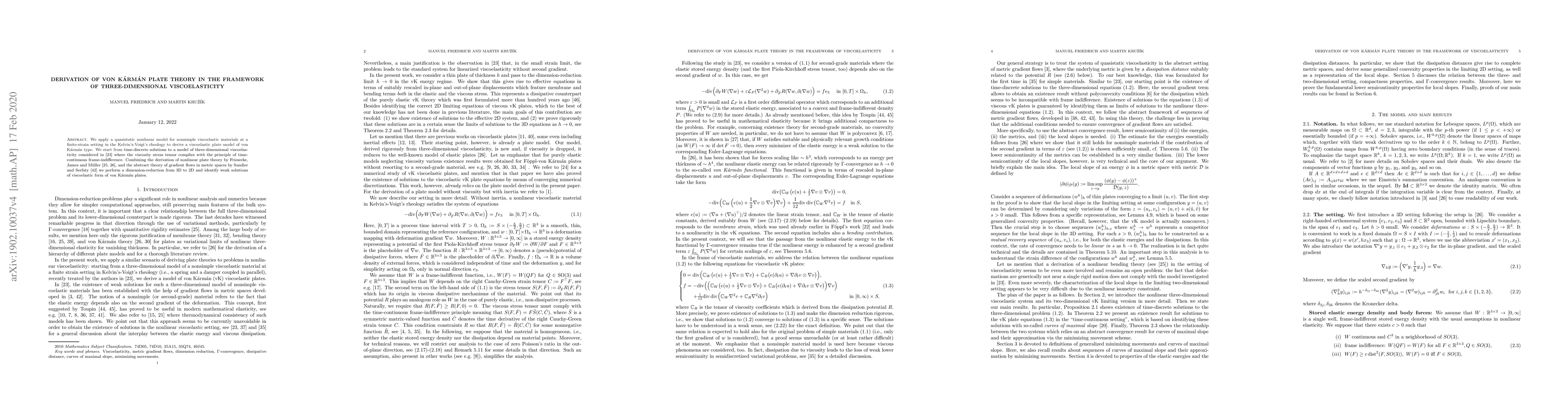 This paper derives a viscoelastic plate model of von Kármán type from a three-dimensional nonlinear viscoelastic model using Kelvin-Voigt rheology. It employs a quasistatic approach and dimension-reduction techniques to identify weak solutions for the 2D plate theory.
