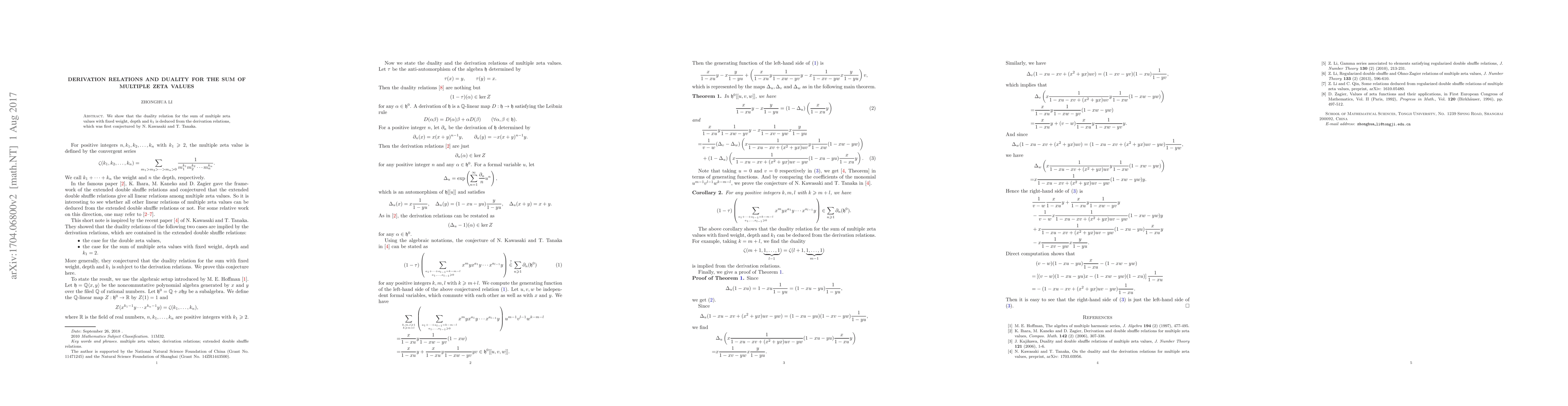 This paper establishes the duality relation for the sum of multiple zeta values through derivation relations, confirming a conjecture by N. Kawasaki and T. Tanaka, and elucidates the relationship between these relations and the duality.
