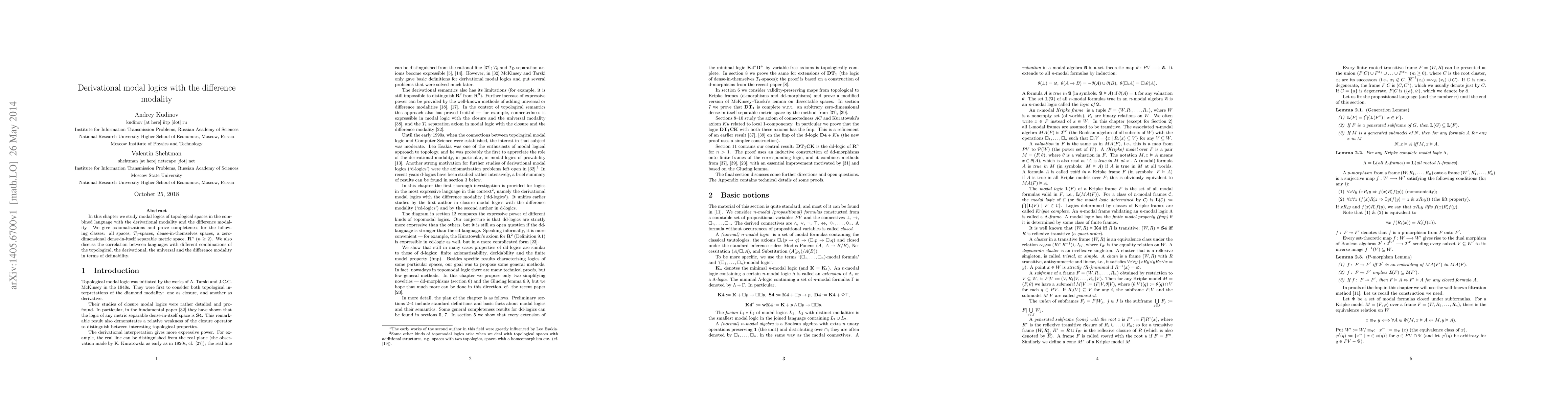 In this chapter we study modal logics of topological spaces in the combined language with the derivational modality and the difference modality. We give axiomatizations and prove completeness for the following classes: all spaces, $T_1$-spaces, dense-in-themselves spaces, a zero-dimensional dense-in-itself separable metric space, $R^n$ $(n\ge 2)$. We also discuss the correlation between languages with different combinations of the topological, the derivational, the universal and the difference modality in terms of definability.