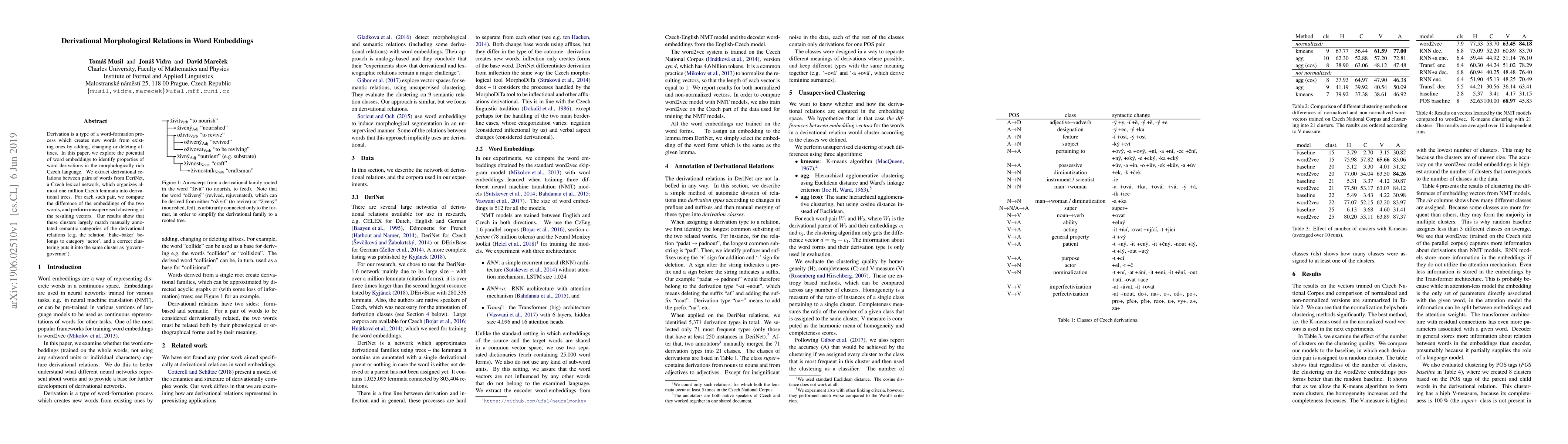 Derivation is a type of a word-formation process which creates new words from existing ones by adding, changing or deleting affixes. In this paper, we explore the potential of word embeddings to identify properties of word derivations in the morphologically rich Czech language. We extract derivational relations between pairs of words from DeriNet, a Czech lexical network, which organizes almost one million Czech lemmata into derivational trees. For each such pair, we compute the difference of the embeddings of the two words, and perform unsupervised clustering of the resulting vectors. Our results show that these clusters largely match manually annotated semantic categories of the derivational relations (e.g. the relation 'bake--baker' belongs to category 'actor', and a correct clustering puts it into the same cluster as 'govern--governor').