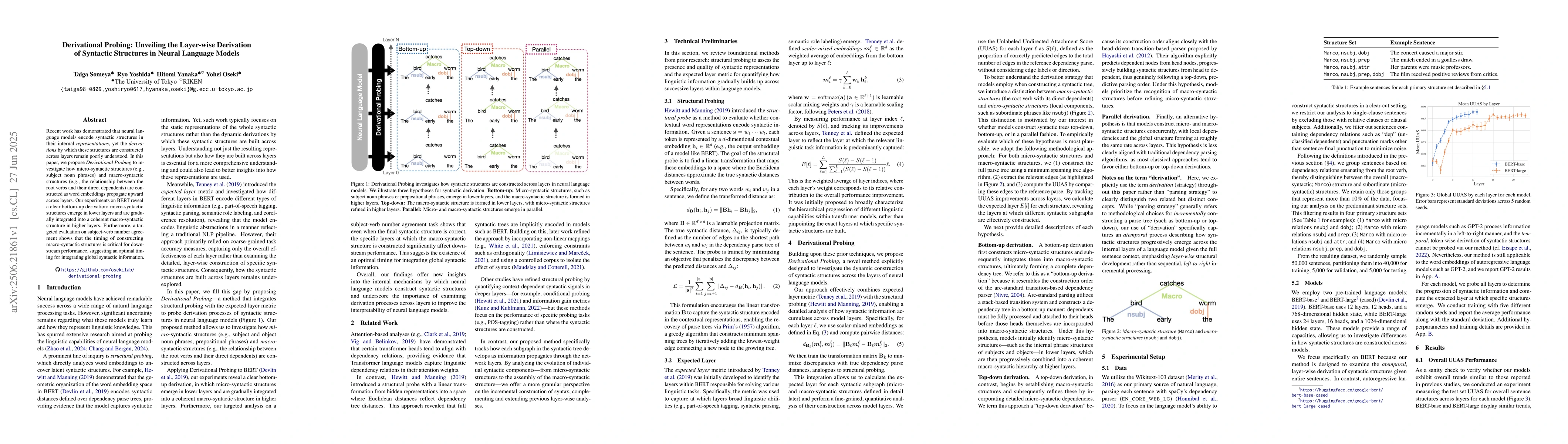 The paper introduces Derivational Probing, a method that combines structural probing with an expected layer metric to trace the construction process of syntactic structures in neural language models. This method is applied to BERT models, examining the layer-wise development of micro- and macro-syntactic structures.