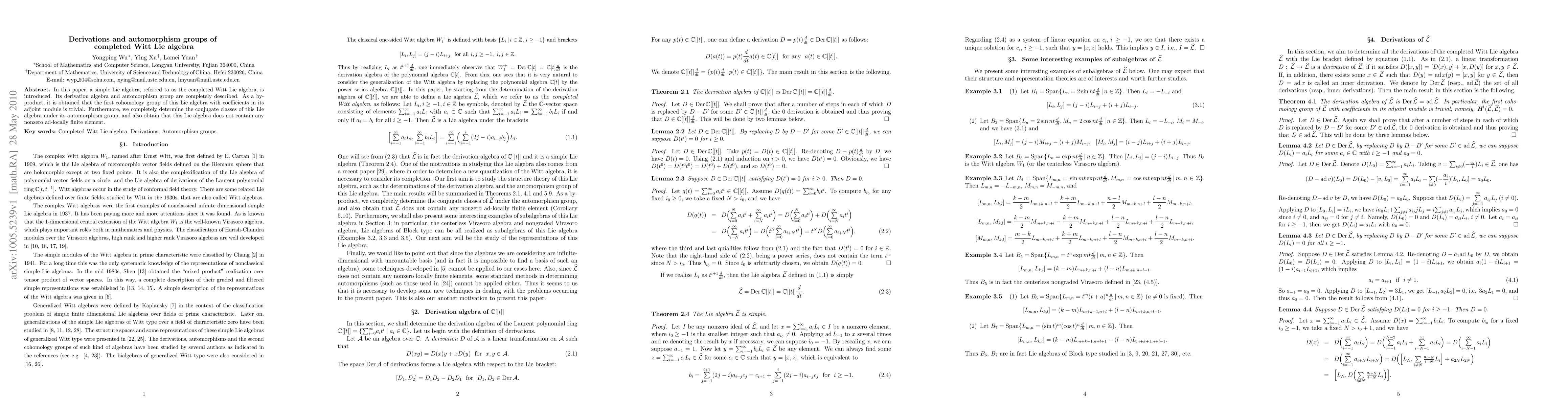 This paper introduces the completed Witt Lie algebra, detailing its derivation algebra and automorphism group. It finds that the first cohomology group with its adjoint module is trivial and determines the conjugate classes under its automorphism group, concluding that the algebra contains no nonzero ad-locally finite elements.