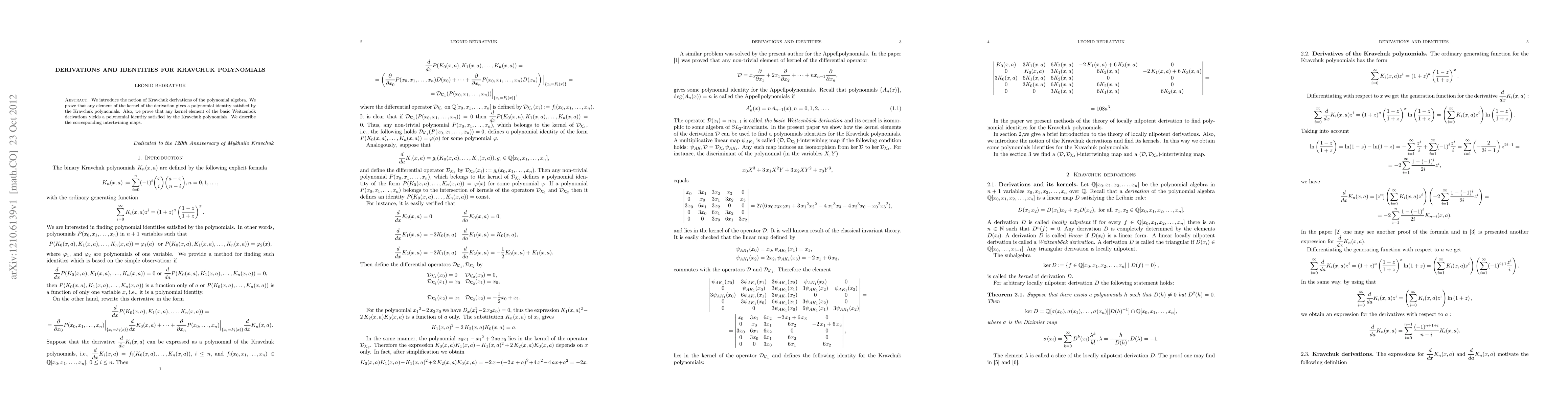 This paper presents Kravchuk derivations for polynomial algebra, proving that elements in the derivation's kernel generate identities for Kravchuk polynomials. It also demonstrates that Weitzenböck derivations' kernel elements yield similar identities, describing the related intertwining maps.