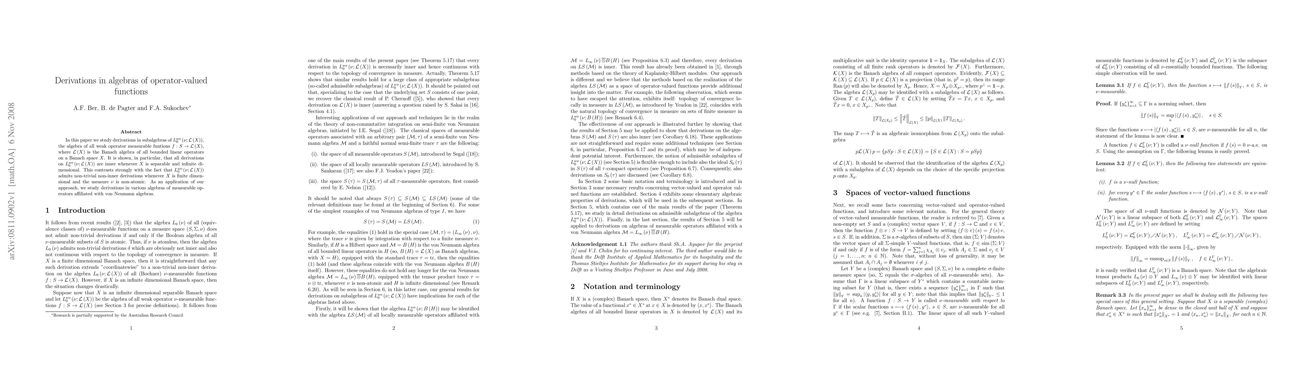 In this paper we study derivations in subalgebras of $L_{0}^{wo}(\nu ;% \mathcal{L}(X)) $, the algebra of all weak operator measurable funtions $f:S\to \mathcal{L}(X) $, where $% \mathcal{L}(X) $ is the Banach algebra of all bounded linear operators on a Banach space $X$. It is shown, in particular, that all derivations on $L_{0}^{wo}(\nu ;\mathcal{L}(X)) $ are inner whenever $X$ is separable and infinite dimensional. This contrasts strongly with the fact that $L_{0}^{wo}(\nu ;\mathcal{L}(X)) $ admits non-trivial non-inner derivations whenever $X$ is finite dimensional and the measure $\nu $ is non-atomic. As an application of our approach, we study derivations in various algebras of measurable operators affiliated with von Neumann algebras.