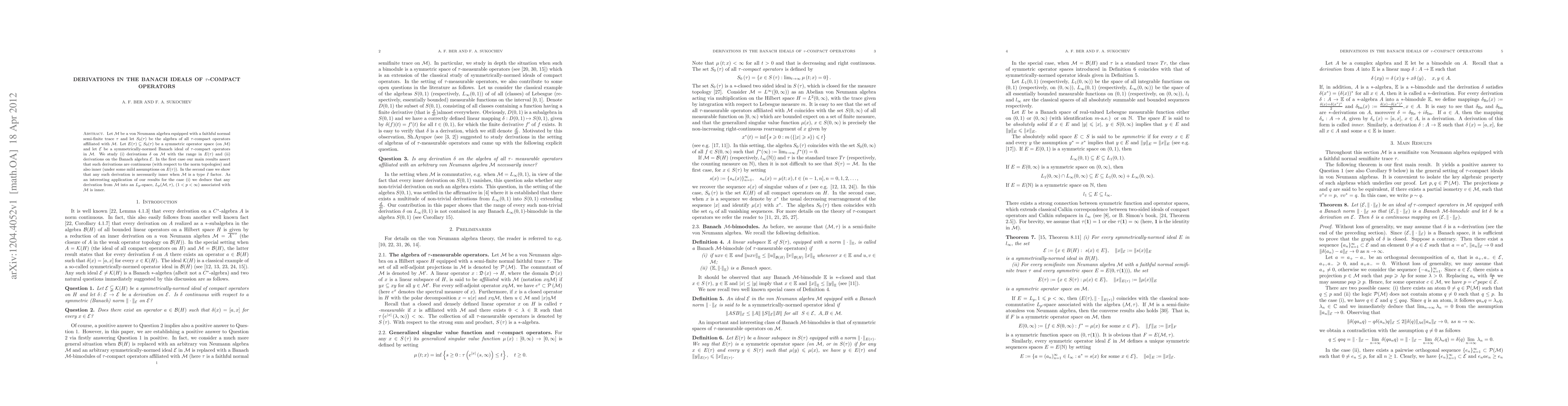 This paper explores derivations in the Banach ideals of $\tau$-compact operators affiliated with a von Neumann algebra $\mathcal{M}$ equipped with a faithful normal semi-finite trace $\tau$. It proves that derivations from $\mathcal{M}$ into a symmetric operator space $E(\tau)$ are continuous and inner under mild assumptions, and that derivations from $\mathcal{E}$ into $\mathcal{M}$ are inner when $\mathcal{M}$ is a type $I$ factor.