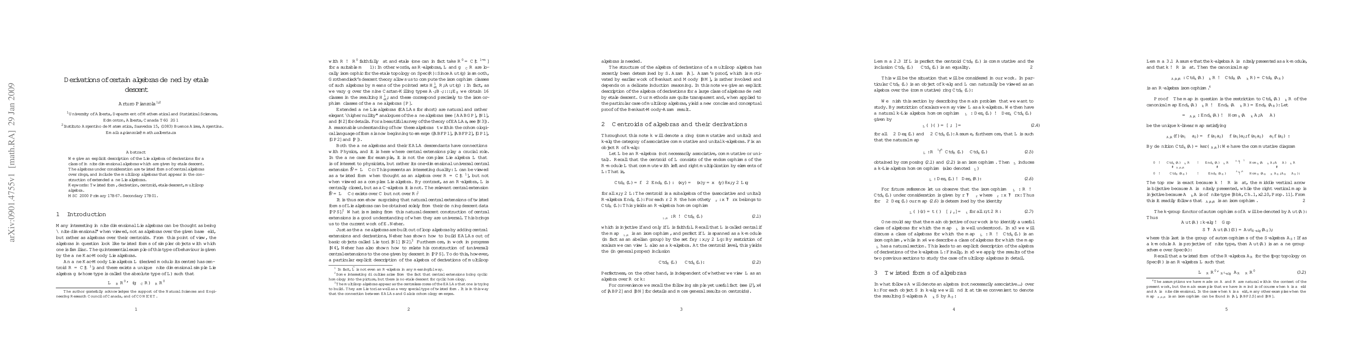 We give an explicit description of the Lie algebra of derivations for a class of infinite dimensional algebras which are given by \'etale descent. The algebras under consideration are twisted forms of central algebras over rings, and include the multiloop algebras that appear in the construction of extended affine Lie algebras.