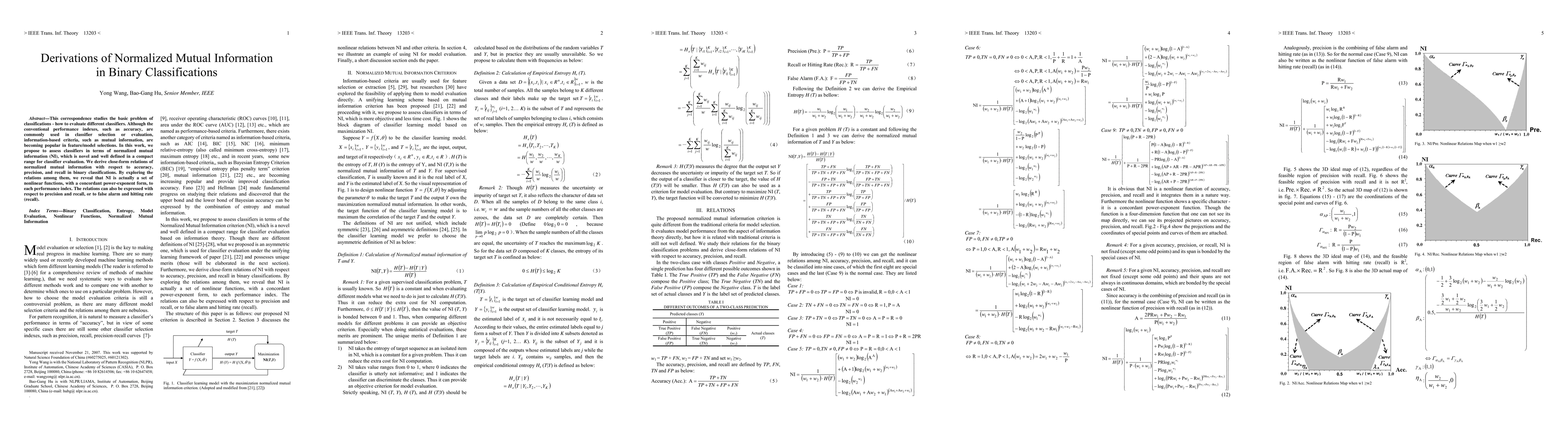 This paper proposes the use of normalized mutual information (NI) for evaluating binary classifiers, deriving its close-form relations with accuracy, precision, and recall. It reveals NI as a set of nonlinear functions linked to these performance metrics, providing a novel approach for classifier assessment.