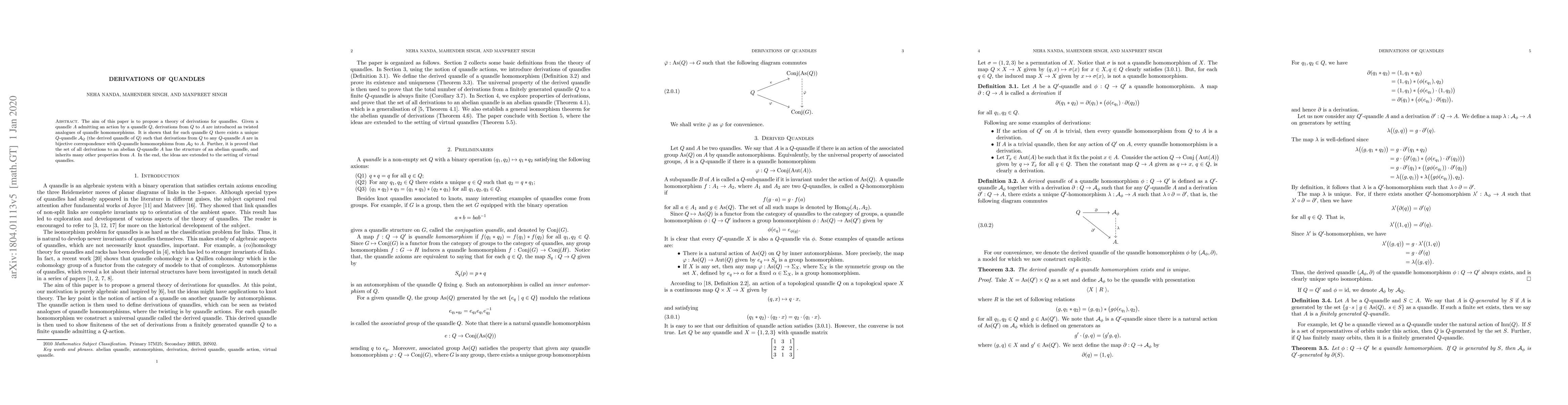 This paper introduces a theory of derivations for quandles, proposing twisted analogues of quandle homomorphisms for quandles $A$ acted upon by quandle $Q$. It establishes a unique $Q$-quandle $\mathcal{A}_Q$ whose homomorphisms correspond bijectively with derivations from $Q$ to $A$, and shows that the set of all derivations to an abelian $Q$-quandle $A$ forms an abelian quandle.