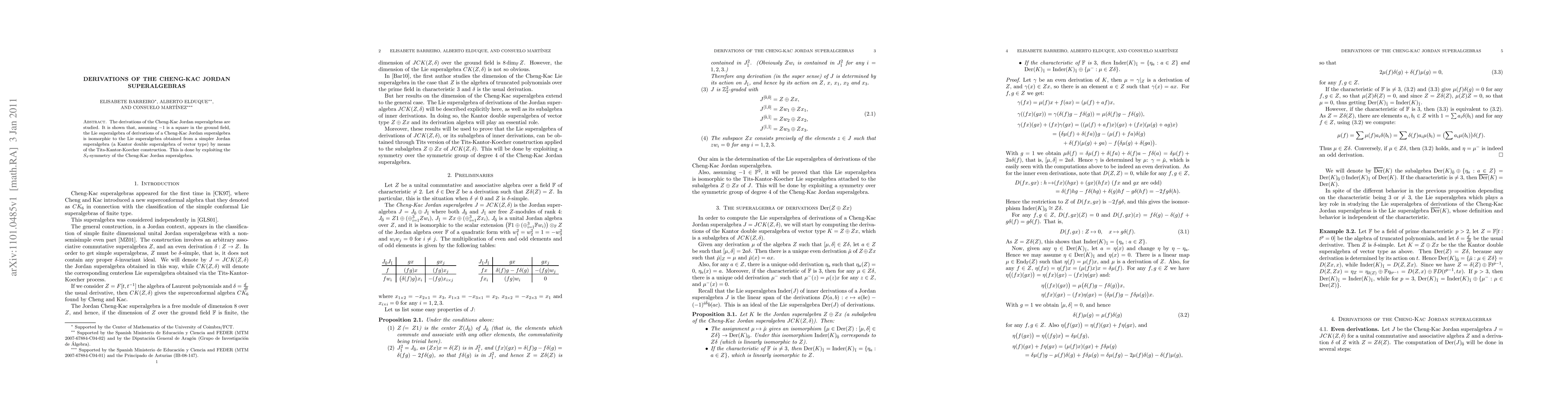The derivations of the Cheng-Kac Jordan superalgebras are studied. It is shown that, assuming -1 is a square in the ground field, the Lie superalgebra of derivations of a Cheng-Kac Jordan superalgebra is isomorphic to the Lie superalgebra obtained from a simpler Jordan superalgebra (a Kantor double superalgebra of vector type) by means of the Tits-Kantor-Koecher construction. This is done by exploiting the S4-symmetry of the Cheng-Kac Jordan superalgebra.