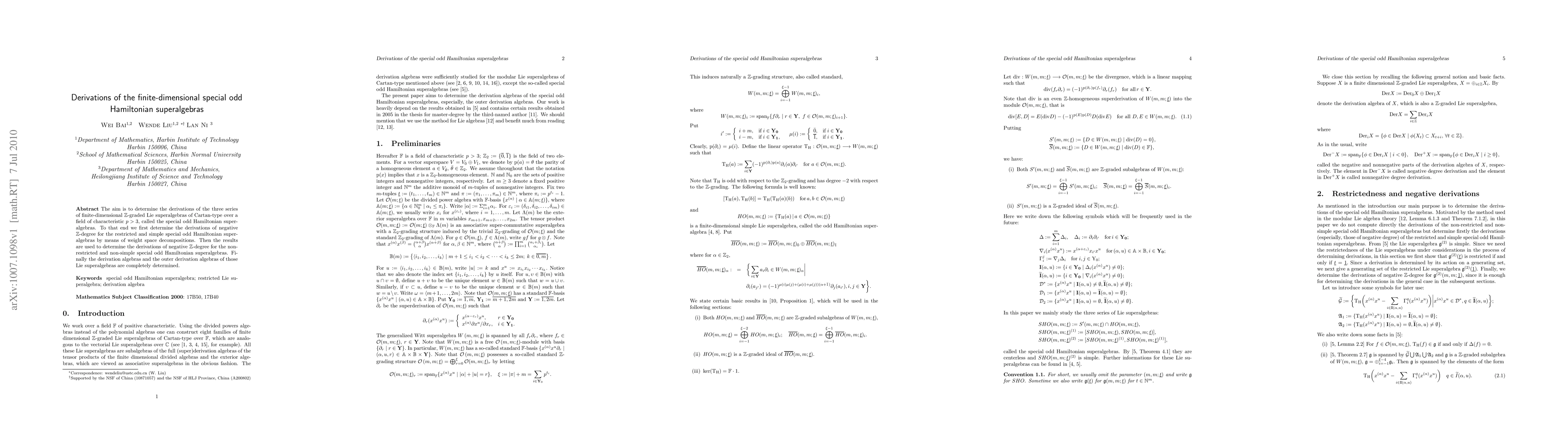 This paper determines the derivations of finite-dimensional special odd Hamiltonian superalgebras, focusing on negative Z-degree derivations via weight space decompositions. The findings are used to fully characterize the derivation and outer derivation algebras of these superalgebras.