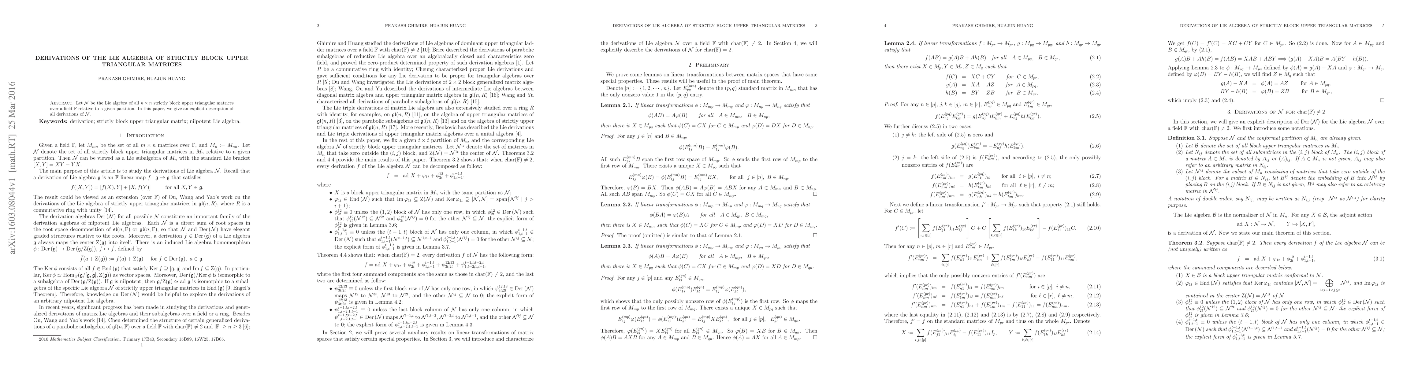 Summary: This paper provides an explicit description of the derivations of the Lie algebra ${\mathcal N}$ comprising $n\times n$ strictly block upper triangular matrices over a field ${\mathbb F}$, relative to a specified partition. The derivations are thoroughly characterized.