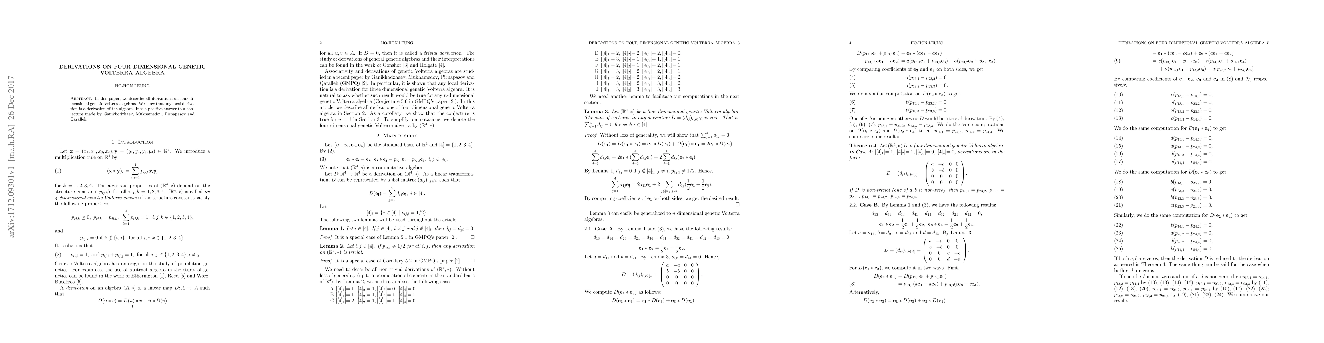 In this paper, we describe all derivations on four dimensional genetic Volterra algebras. We show that any local derivation is a derivation of the algebra. It is a positive answer to a conjecture made by Ganikhodzhaev, Mukhamedov, Pirnapasov and Qaralleh.