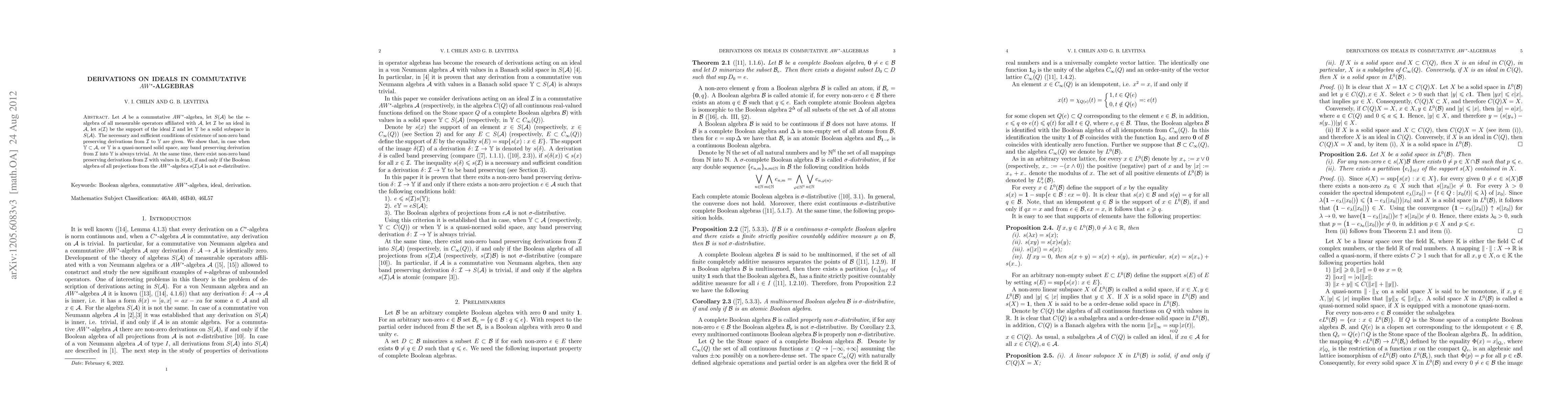 Let $\mathcal{A}$ be a commutative $AW^*$-algebra, let $S(\mathcal{A})$ be the *-algebra of all measurable operators affiliated with $\mathcal{A}$, let $\mathcal{I}$ be an ideal in $\mathcal{A}$, let $s(\mathcal{I})$ be the support of the ideal $\mathcal{I}$ and let $\mathbb{Y}$ be a solid subspace in $S(\mathcal{A})$. The necessary and sufficient conditions of existence of non-zero band preserving derivations from $\mathcal{I}$ to $\mathbb{Y}$ are given. We show that, in case when $\mathbb{Y}\subset\mathcal{A}$, or $\mathbb{Y}$ is a quasi-normed solid space, any band preserving derivation from $\mathcal{I}$ into $\mathbb{Y}$ is always trivial. At the same time, there exist non-zero band preserving derivations from $\mathcal{I}$ with values in $S(\mathcal{A})$, if and only if the Boolean algebra of all projections from the $AW^*$-algebra $s(\mathcal{I})\mathcal{A}$ is not $\sigma$-distributive.