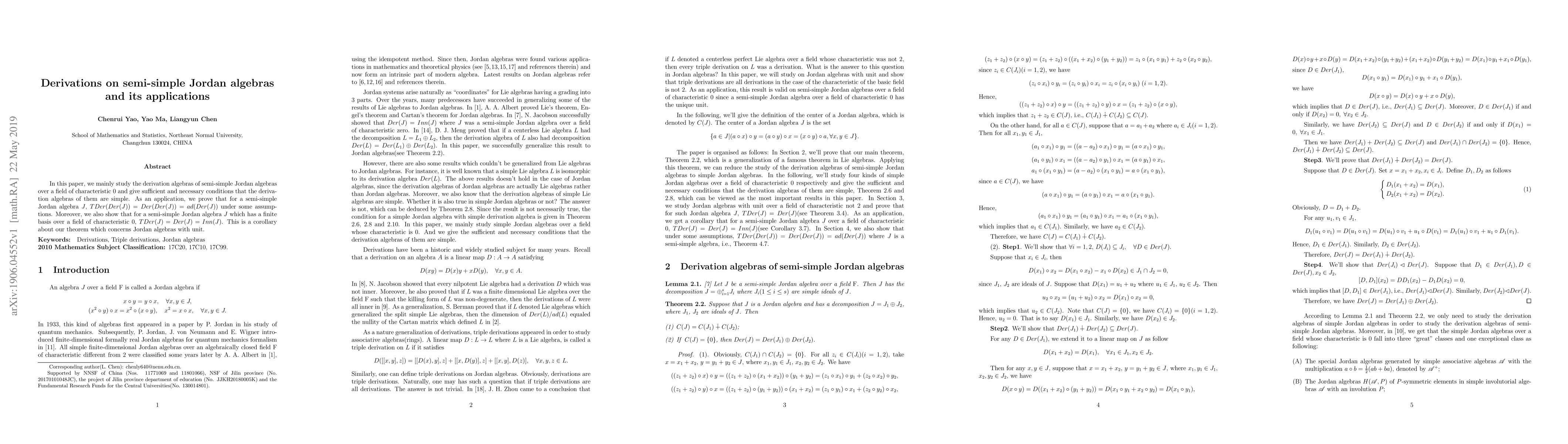 This paper studies derivation algebras of semi-simple Jordan algebras, providing conditions for their simplicity and exploring applications to Jordan algebras with unit, including equalities between derivations, inner automorphisms, and the derived algebra.