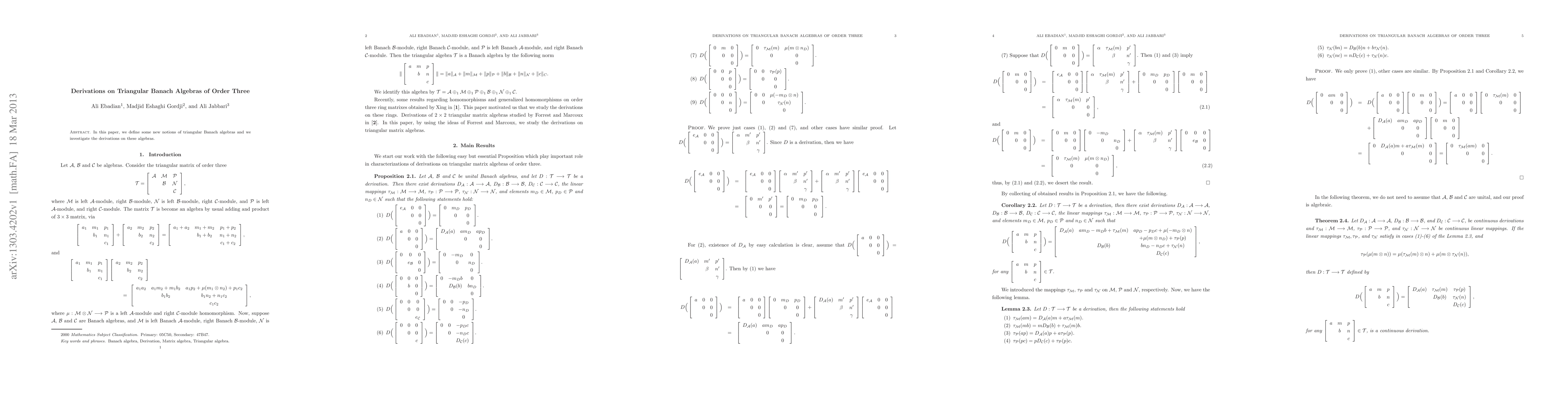 Summary: This paper introduces new concepts for triangular Banach algebras of order three and explores the properties and characteristics of derivations within these newly defined algebraic structures.