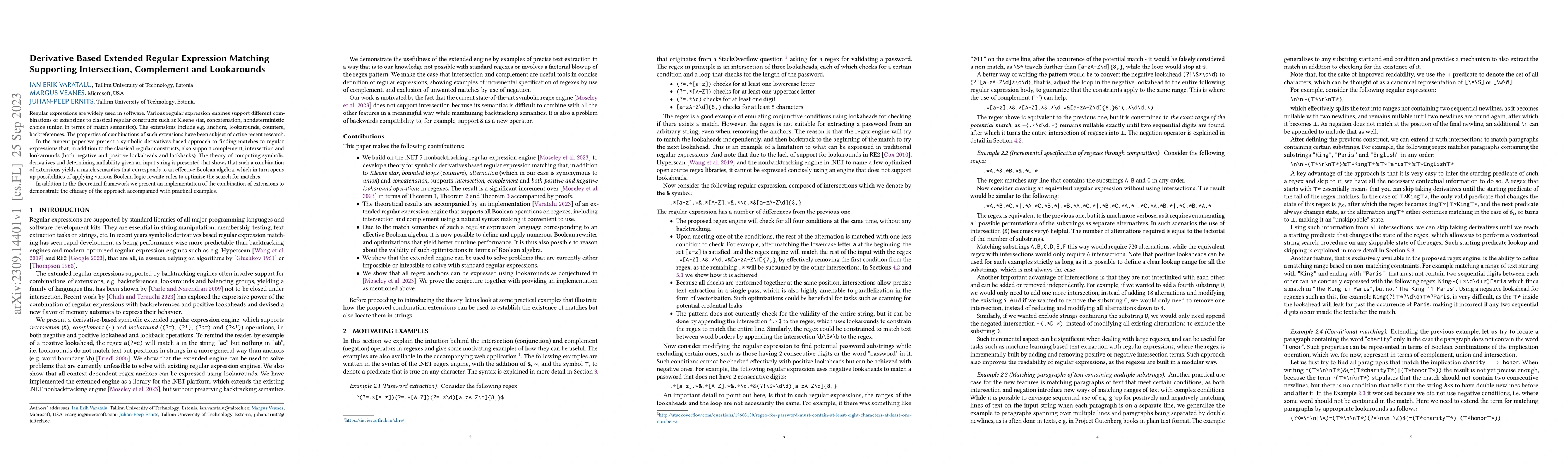 This paper introduces a symbolic derivatives-based method for matching extended regular expressions that support complement, intersection, and lookarounds. It presents a theoretical framework showing that these extensions correspond to an effective Boolean algebra, enabling Boolean logic optimizations, and demonstrates the approach with an implementation and practical examples.