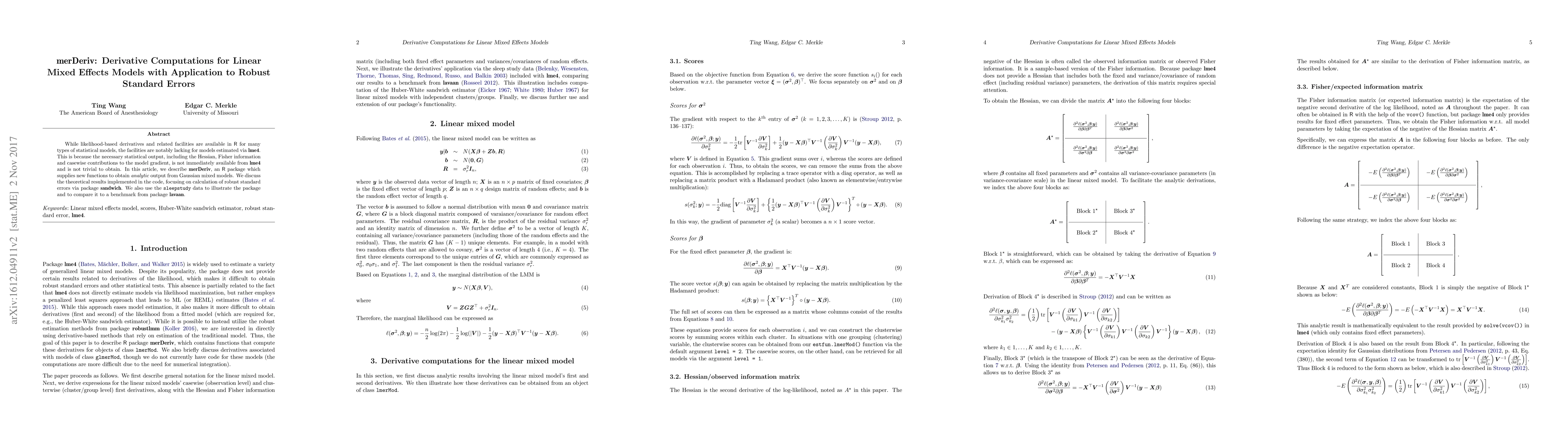 This paper introduces two new functions, estfun.lmerMod() and vcov.full.lmerMod(), to compute robust standard errors for linear mixed effects models in R's lme4 package. It discusses the theoretical underpinnings and uses the Sleepstudy dataset to demonstrate the implementation and compare results to those from lavaan.