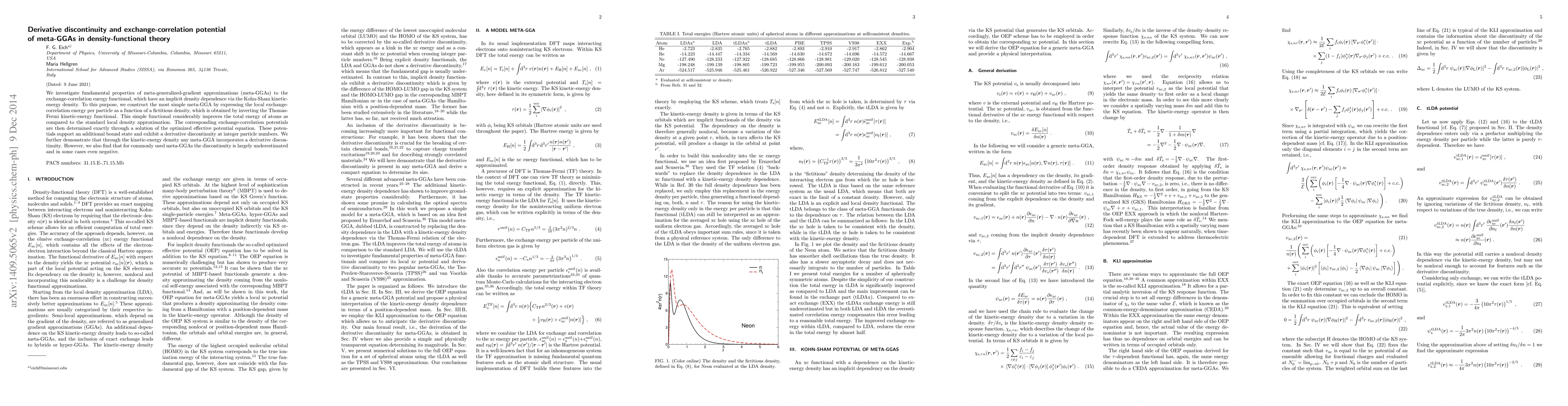 We investigate fundamental properties of meta-generalized-gradient approximations (meta-GGAs) to the exchange-correlation energy functional, which have an implicit density dependence via the Kohn-Sham kinetic-energy density. To this purpose, we construct the most simple meta-GGA by expressing the local exchange-correlation energy per particle as a function of a fictitious density, which is obtained by inverting the Thomas-Fermi kinetic-energy functional. This simple functional considerably improves the total energy of atoms as compared to the standard local density approximation. The corresponding exchange-correlation potentials are then determined exactly through a solution of the optimized effective potential equation. These potentials support an additional bound state and exhibit a derivative discontinuity at integer particle numbers. We further demonstrate that through the kinetic-energy density any meta-GGA incorporates a derivative discontinuity. However, we also find that for commonly used meta-GGAs the discontinuity is largely underestimated and in some cases even negative.