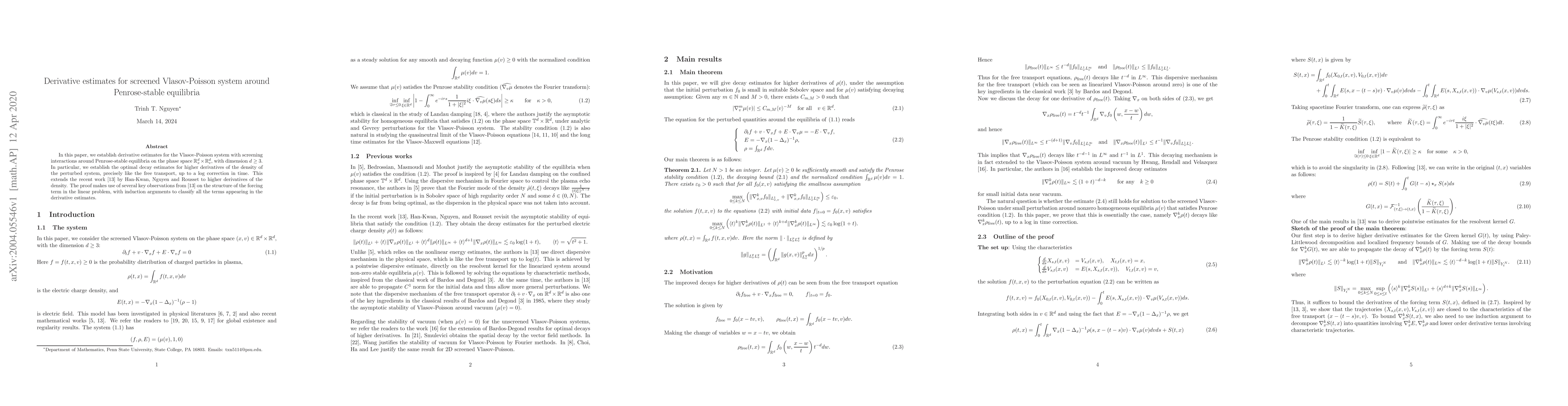 In this paper, we establish derivative estimates for the Vlasov-Poisson system with screening interactions around Penrose-stable equilibria on the phase space $\mathbb{R}^d_x\times \mathbb{R}_v^d$, with dimension $d\ge 3$. In particular, we establish the optimal decay estimates for higher derivatives of the density of the perturbed system, precisely like the free transport, up to a log correction in time. This extends the recent work \cite{T-R-HK} by Han-Kwan, Nguyen and Rousset to higher derivatives of the density. The proof makes use of several key observations from \cite{T-R-HK} on the structure of the forcing term in the linear problem, with induction arguments to classify all the terms appearing in the derivative estimates.