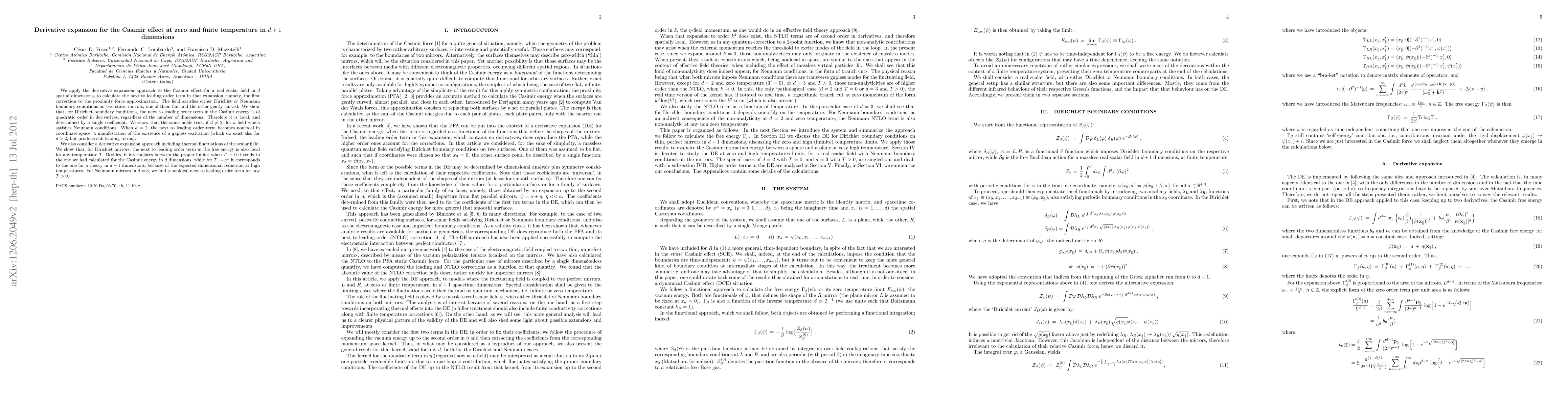 This paper applies the derivative expansion method to calculate the next to leading order term in the Casimir effect for a scalar field with Dirichlet or Neumann boundary conditions, showing that the term is local and determined by a single coefficient for most dimensions and conditions. It also extends the analysis to finite temperatures, demonstrating that the next to leading order term remains local for Dirichlet mirrors across all temperatures, while for Neumann mirrors in three dimensions, it becomes nonlocal at any finite temperature.