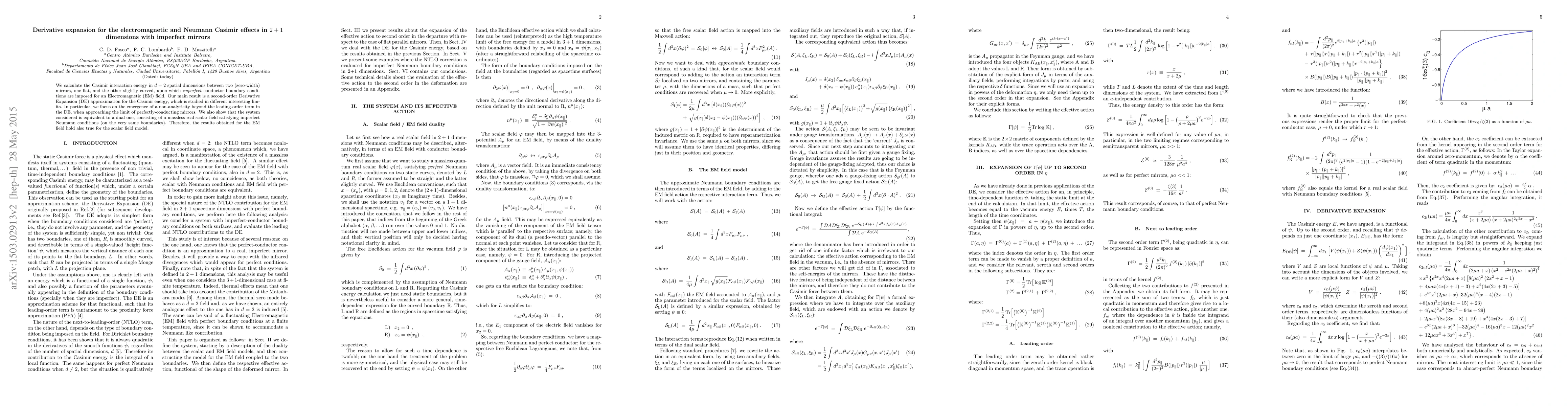 We calculate the Casimir interaction energy in $d=2$ spatial dimensions between two (zero-width) mirrors, one flat, and the other slightly curved, upon which {\em imperfect\/} conductor boundary conditions are imposed for an Electromagnetic (EM) field. Our main result is a second-order Derivative Expansion (DE) approximation for the Casimir energy, which is studied in different interesting limits. In particular, we focus on the emergence of a non-analyticity beyond the leading-order term in the DE, when approaching the limit of perfectly-conducting mirrors. We also show that the system considered is equivalent to a dual one, consisting of a massless real scalar field satisfying imperfect Neumann conditions (on the very same boundaries). Therefore, the results obtained for the EM field hold also true for the scalar field model