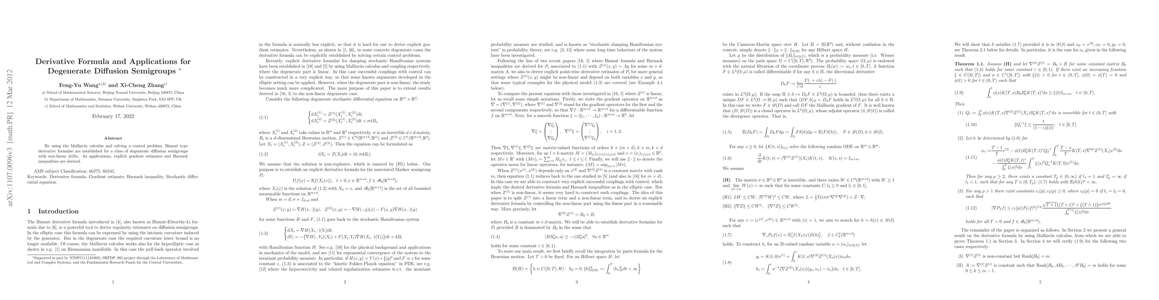 This paper establishes Bismut type derivative formulae for degenerate diffusion semigroups using Malliavin calculus and control problems. It also derives explicit gradient estimates and Harnack inequalities as applications.