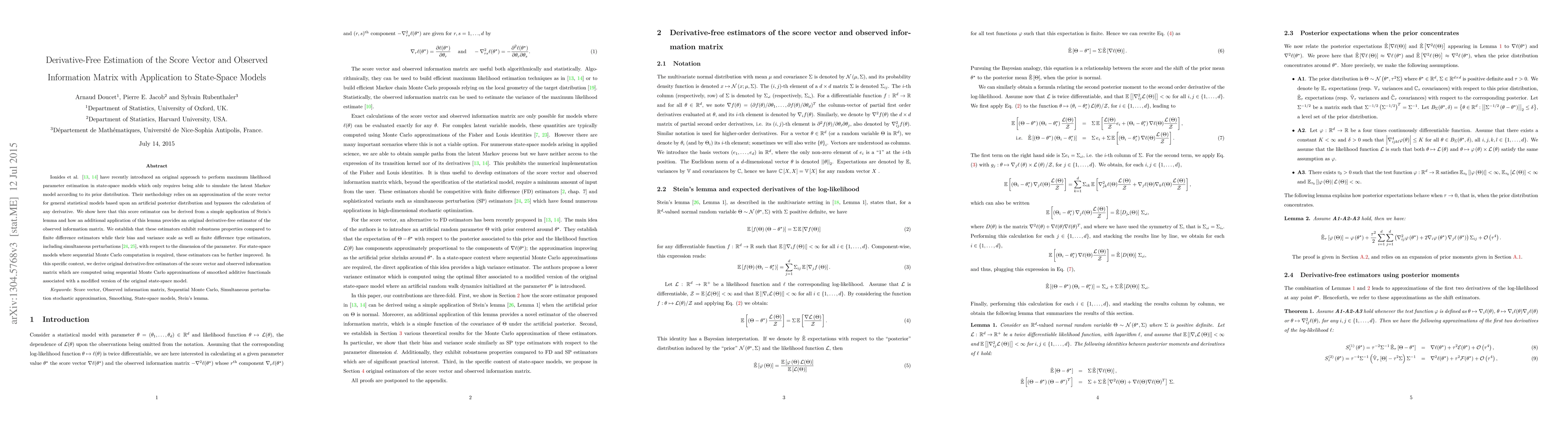 Ionides, King et al. (see e.g. Inference for nonlinear dynamical systems, PNAS 103) have recently introduced an original approach to perform maximum likelihood parameter estimation in state-space models which only requires being able to simulate the latent Markov model according to its prior distribution. Their methodology relies on an approximation of the score vector for general statistical models based upon an artificial posterior distribution and bypasses the calculation of any derivative. We show here that this score estimator can be derived from a simple application of Stein's lemma and how an additional application of this lemma provides an original derivative-free estimator of the observed information matrix. We establish that these estimators exhibit robustness properties compared to finite difference estimators while their bias and variance scale as well as finite difference type estimators, including simultaneous perturbations (see e.g. Spall, IEEE Trans. on Automatic Control 37), with respect to the dimension of the parameter. For state-space models where sequential Monte Carlo computation is required, these estimators can be further improved. In this specific context, we derive original derivative-free estimators of the score vector and observed information matrix which are computed using sequential Monte Carlo approximations of smoothed additive functionals associated with a modified version of the original state-space model.