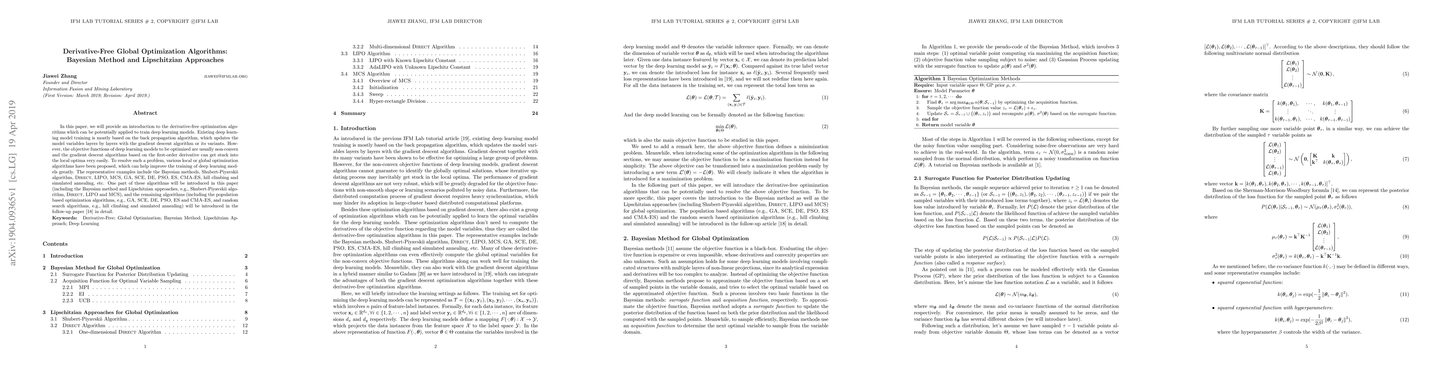 This paper introduces derivative-free global optimization algorithms, including Bayesian methods and Lipschitzian approaches, to improve the training of deep learning models, which often suffer from non-convex objective functions and local optima issues. The paper will focus on these specific methods, with other optimization algorithms to be detailed in a follow-up paper.