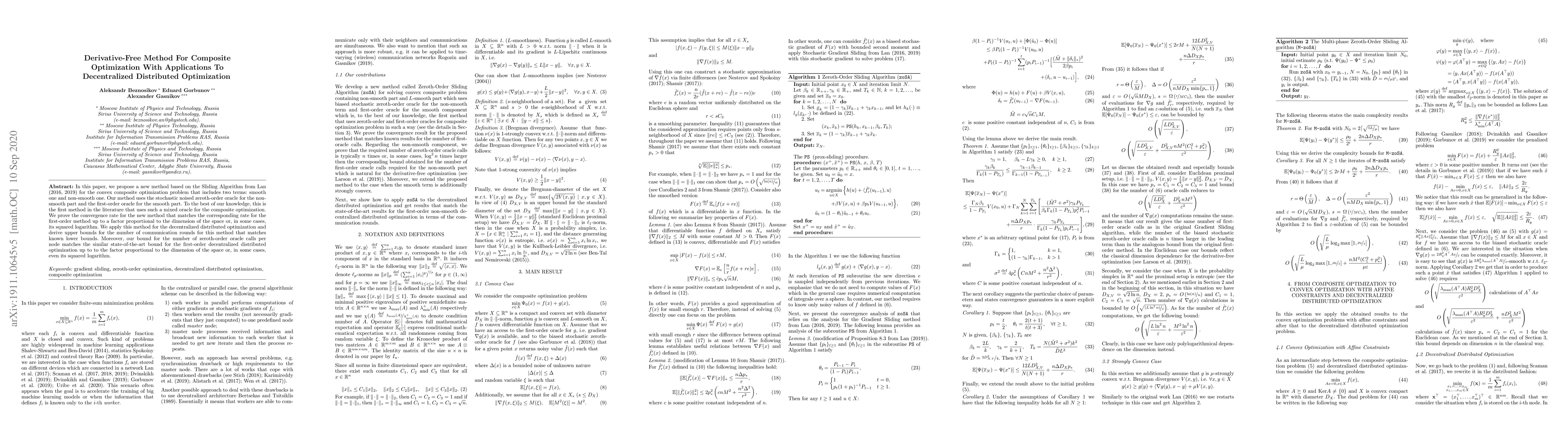 In this paper, we propose a new method based on the Sliding Algorithm from Lan(2016, 2019) for the convex composite optimization problem that includes two terms: smooth one and non-smooth one. Our method uses the stochastic noised zeroth-order oracle for the non-smooth part and the first-order oracle for the smooth part. To the best of our knowledge, this is the first method in the literature that uses such a mixed oracle for the composite optimization. We prove the convergence rate for the new method that matches the corresponding rate for the first-order method up to a factor proportional to the dimension of the space or, in some cases, its squared logarithm. We apply this method for the decentralized distributed optimization and derive upper bounds for the number of communication rounds for this method that matches known lower bounds. Moreover, our bound for the number of zeroth-order oracle calls per node matches the similar state-of-the-art bound for the first-order decentralized distributed optimization up to to the factor proportional to the dimension of the space or, in some cases, even its squared logarithm.