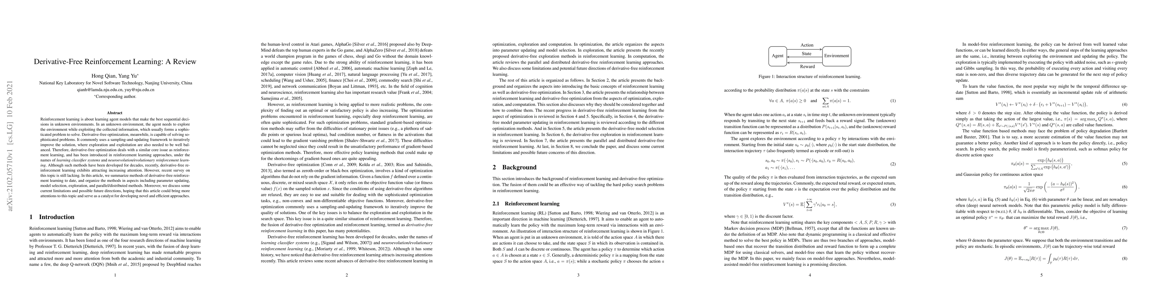 This paper reviews derivative-free reinforcement learning methods, focusing on parameter updating, model selection, exploration strategies, and parallel/distributed approaches. It highlights current limitations and suggests future research directions to spur further development in this increasingly relevant field.