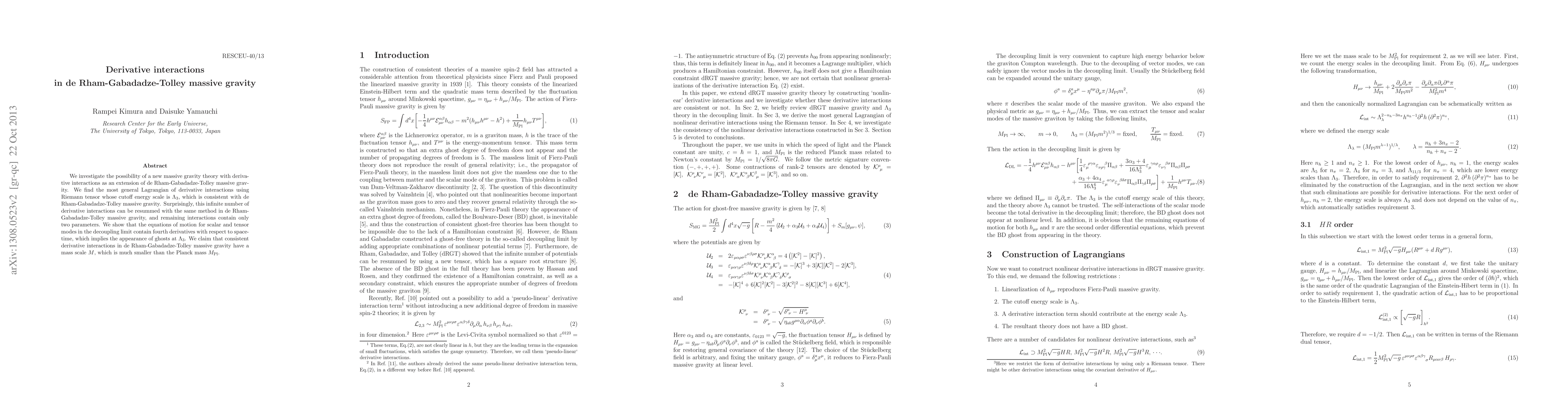 This paper explores a new massive gravity theory with derivative interactions extending de Rham-Gabadadze-Tolley (dRGT) massive gravity, finding that an infinite number of such interactions can be resummed, leading to only two parameters. However, the theory introduces ghosts at a cutoff energy scale $\Lambda_3$, indicating a mass scale $M$ much smaller than the Planck mass $M_{\rm Pl}$.