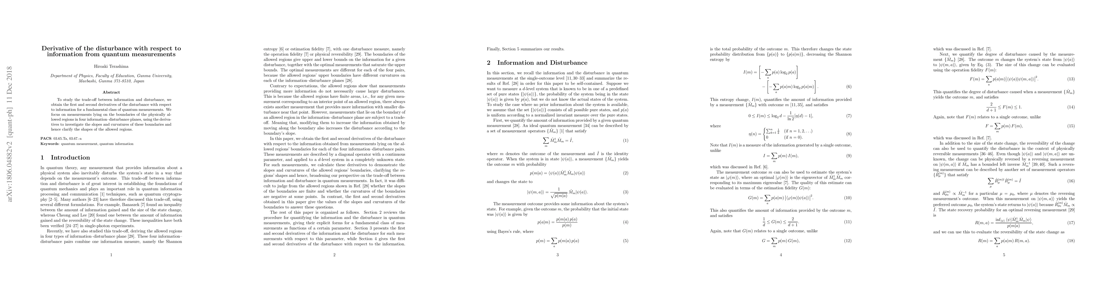 This paper investigates the relationship between information gain and disturbance in quantum measurements by calculating the first and second derivatives of disturbance with respect to information. It analyzes the slopes and curvatures of boundaries in four information-disturbance planes to elucidate the shapes of physically allowed regions.