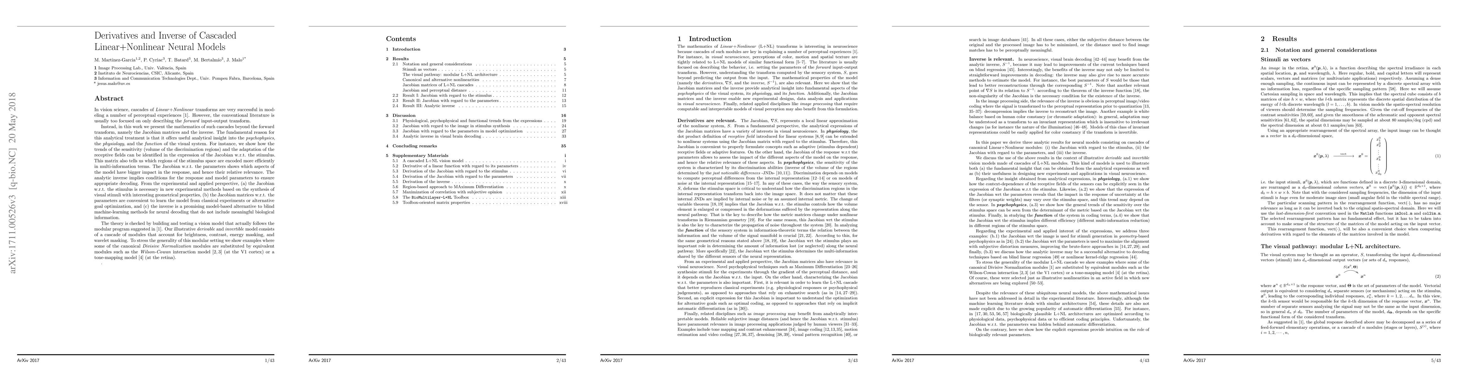 In vision science, cascades of Linear+Nonlinear transforms are very successful in modeling a number of perceptual experiences [Carandini&Heeger12]. However, the conventional literature is usually too focused on only describing the input->output transform. Instead, here we present the maths of such cascades beyond the forward transform, namely the Jacobians and the inverse. The fundamental reason for this analytical treatment is that it offers useful insight into the psychophysics, the physiology, and the function of the visual system. For instance, we show how the trends of the sensitivity (discrimination regions) and the adaptation of the receptive fields can be seen in the expression of the Jacobian wrt the stimulus. This matrix also tells us which regions of the stimulus space are encoded more efficiently in multi-information terms. The Jacobian wrt the parameters shows which aspects of the model have bigger impact in the response, and hence bigger relevance. The analytic inverse implies conditions for the response and the model to ensure decoding. From an applied perspective, (a) the Jacobian wrt the stimulus is necessary in new experimental methods based on the synthesis of visual stimuli with interesting geometry, (b) the Jacobian matrices wrt the parameters are convenient to learn the model from classical experiments or alternative optimization goals, and (c) the inverse is a model-based alternative to blind machine-learning neural decoding that does not include meaningful biological information. The theory is checked by building a derivable and invertible vision model that actually follows the modular program suggested by Carandini&Heeger. To stress the generality of this modular setting we show examples where some of the canonical Divisive Normalization layers are substituted by equivalent layers such as the Wilson-Cowan model at V1, or a tone-mapping model at the retina.