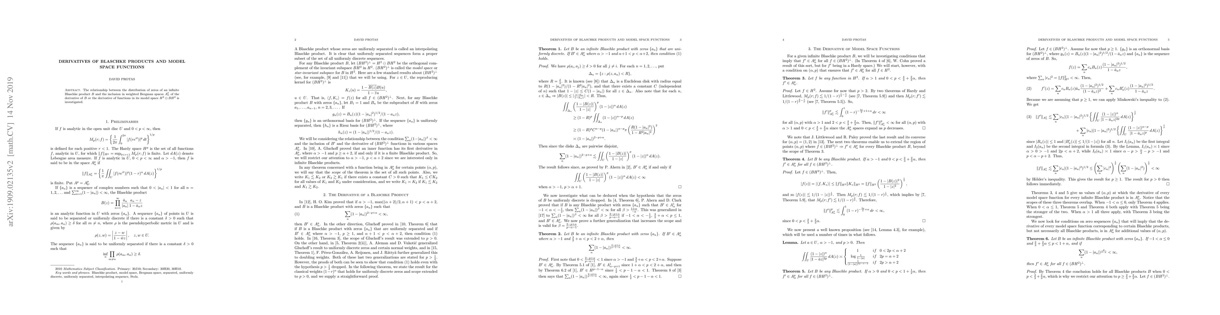 The relationship between the distribution of zeros of an infinite Blaschke product $B$ and the inclusion in weighted Bergman spaces $A_{\alpha}^p$ of the derivative of $B$ or the derivative of functions in its model space $H^2 \ominus BH^2$ is investigated.