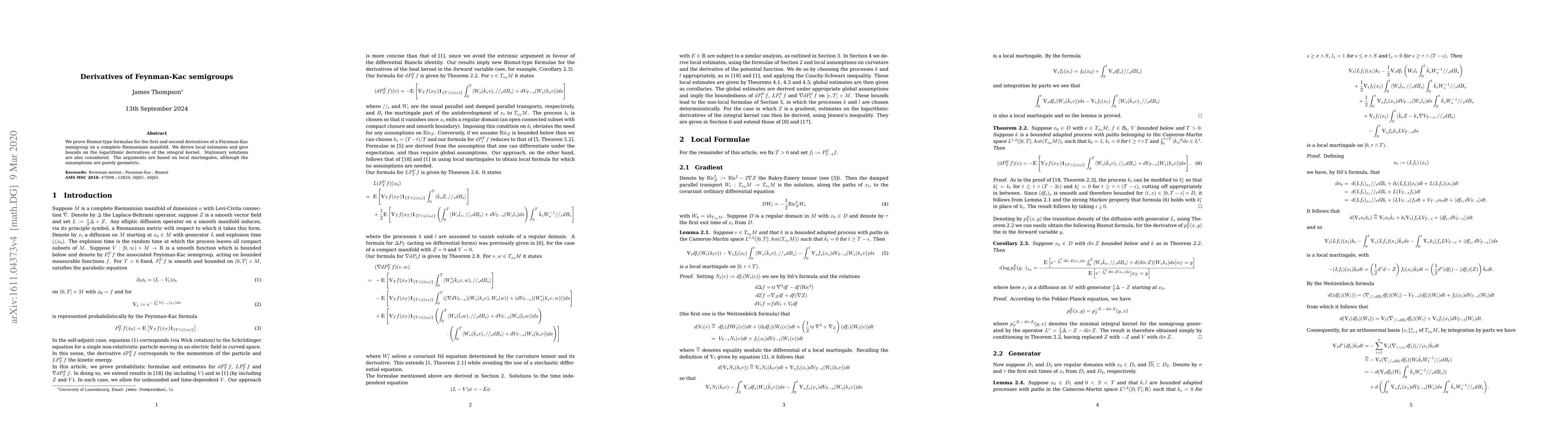 This research proves Bismut-type formulae for first and second derivatives of Feynman-Kac semigroups on Riemannian manifolds, deriving local estimates and bounds on kernel derivatives, relying on local martingales with geometric assumptions. It also examines stationary solutions.