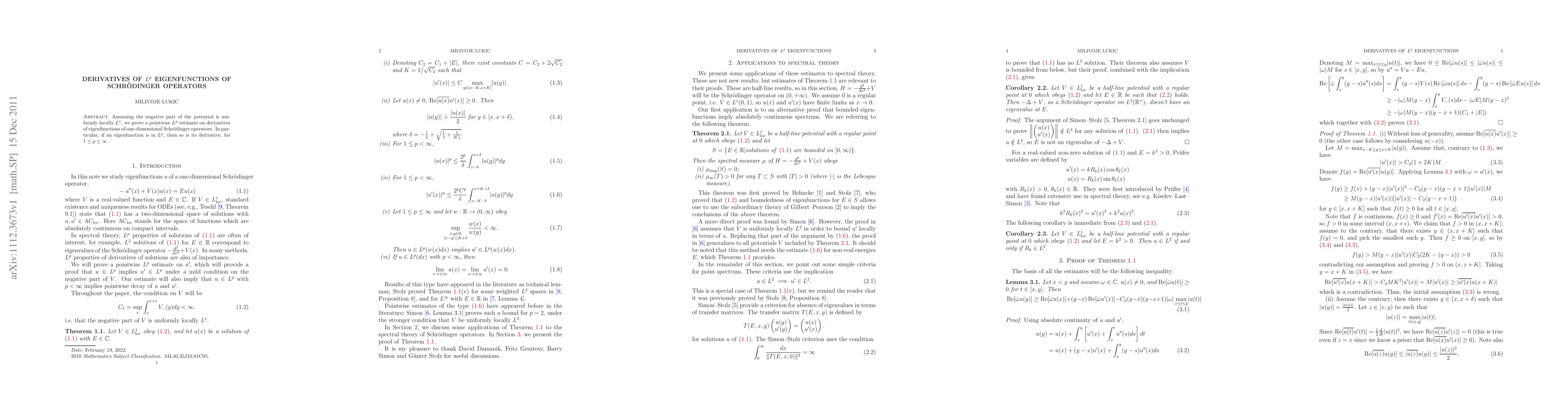 This paper establishes pointwise $L^p$ estimates for derivatives of $L^p$ eigenfunctions of one-dimensional Schrödinger operators, under the condition that the negative part of the potential is uniformly locally $L^1$. Specifically, it shows that if an eigenfunction is in $L^p$, then its derivative is also in $L^p$ for $1\le p\le \infty$.