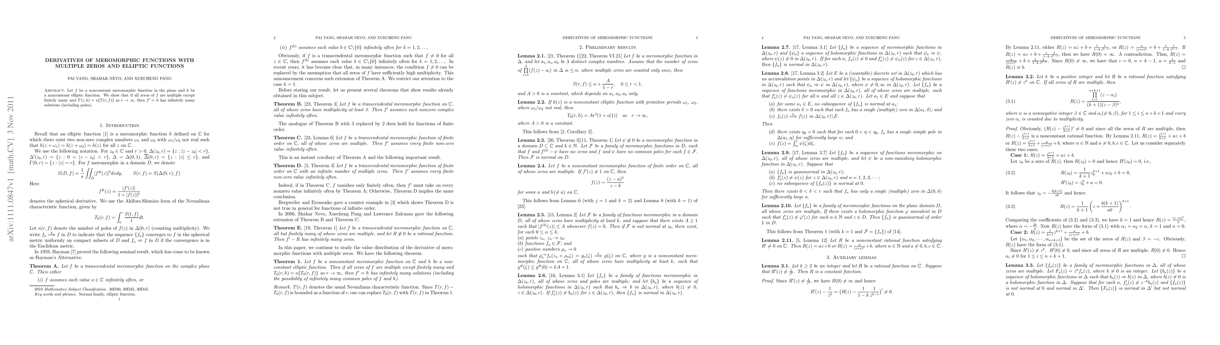 A nonconstant meromorphic function f with multiple zeros except finitely many and an elliptic function h satisfy a specific growth condition, leading to infinitely many solutions for f'=h, including poles.