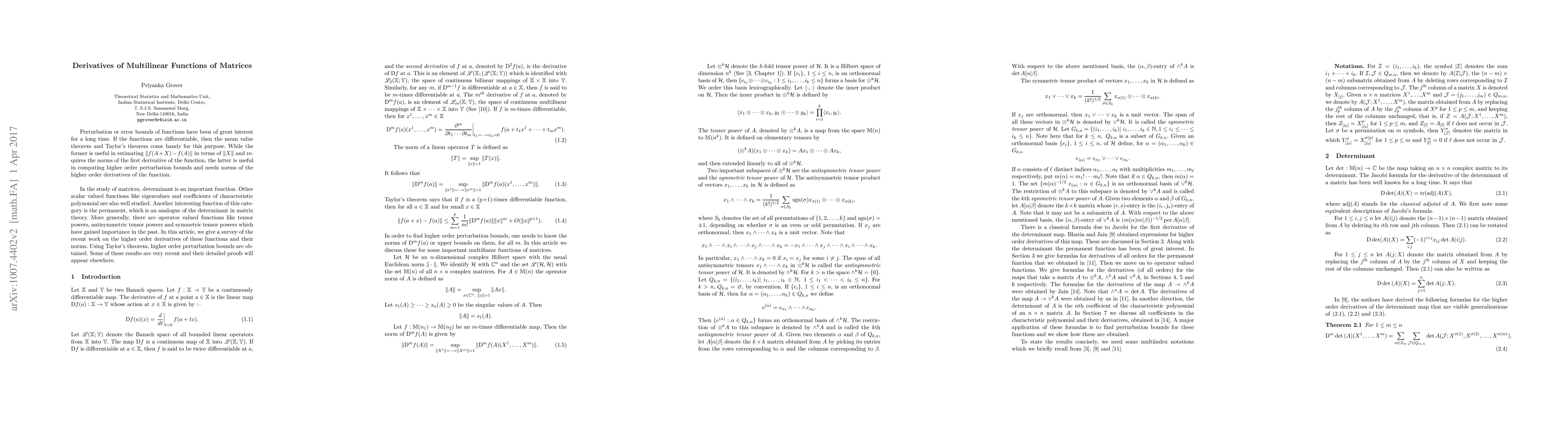 This paper surveys recent work on higher-order derivatives of matrix functions like determinant, eigenvalues, and permanent, using Taylor's theorem to obtain perturbation bounds.