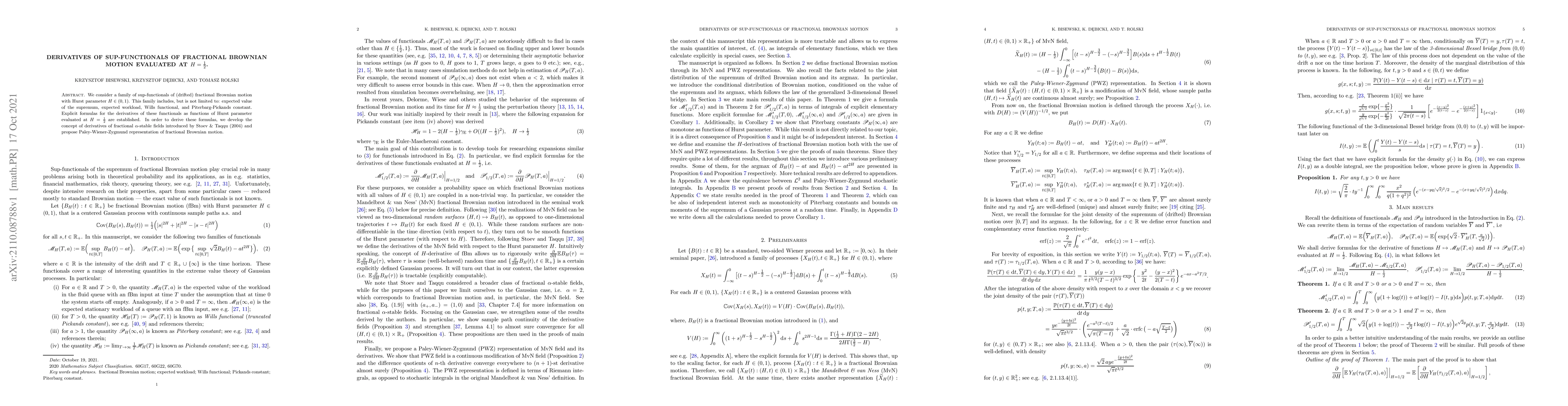 Researchers found explicit formulas for derivatives of sup-functionals of fractional Brownian motion at H=1/2, extending the study to key parameters like expected value and workload.