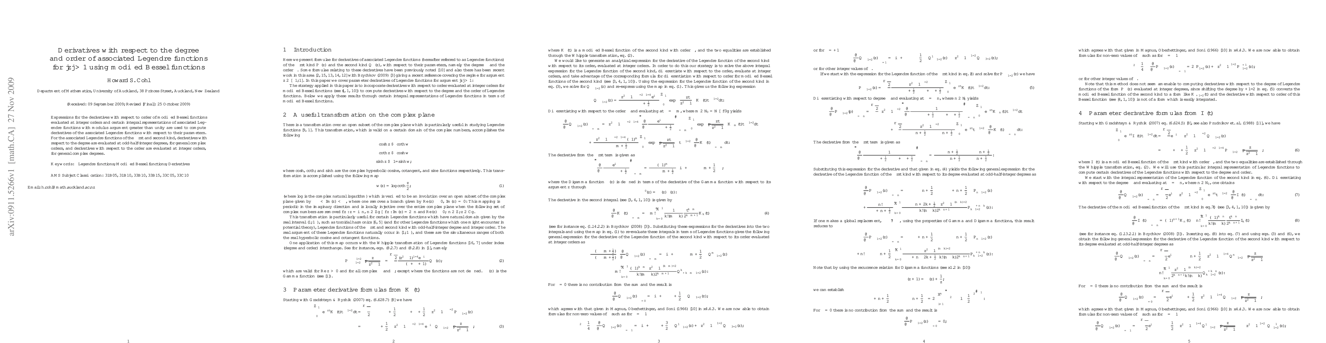 This paper computes derivatives of associated Legendre functions for $|z|>1$ by leveraging derivatives of modified Bessel functions, employing integral representations and specific evaluations at integer orders and odd-half-integer degrees for general complex parameters.