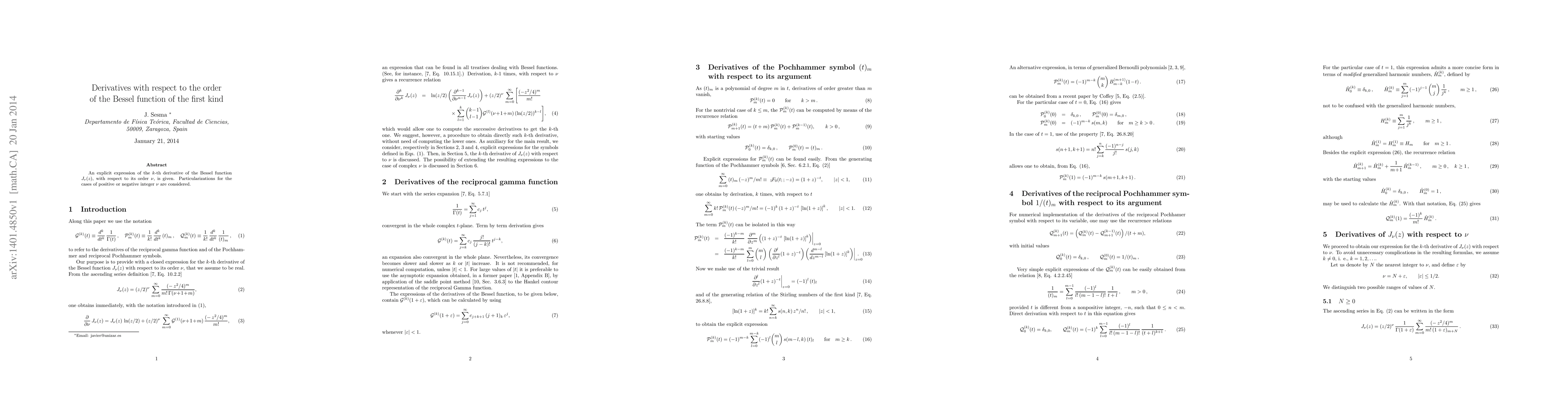 This paper provides an explicit formula for the k-th derivative of the Bessel function $J_\nu(z)$ with respect to its order $\nu$, and explores specific cases for both positive and negative $\nu$.