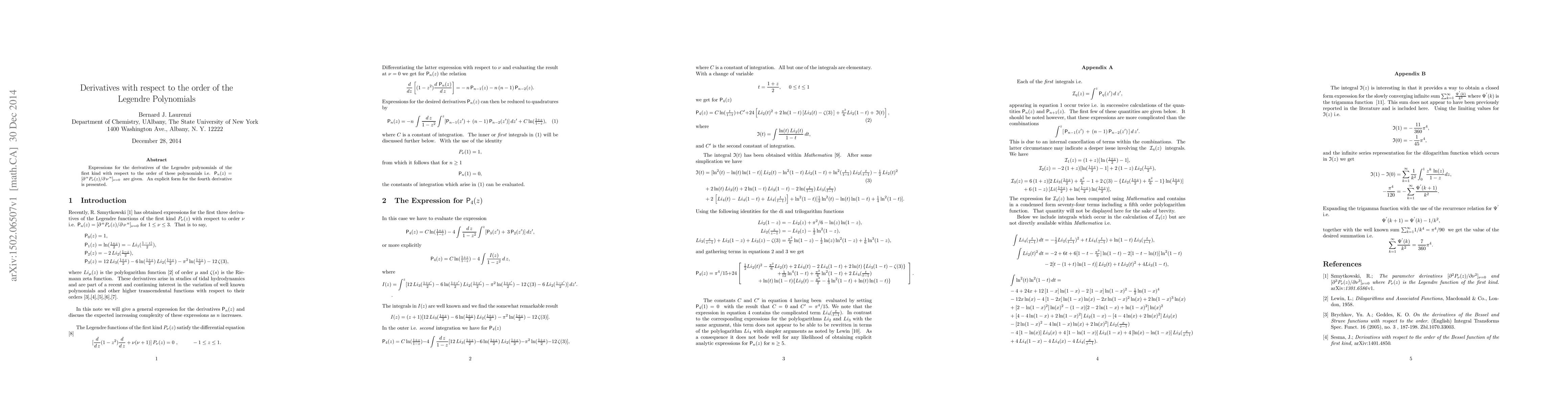 Summary: This paper provides expressions for the derivatives of the first kind of Legendre polynomials with respect to their order, with a particular focus on presenting an explicit form for the fourth derivative. The results enhance the mathematical toolkit for handling Legendre polynomials in various applications.
