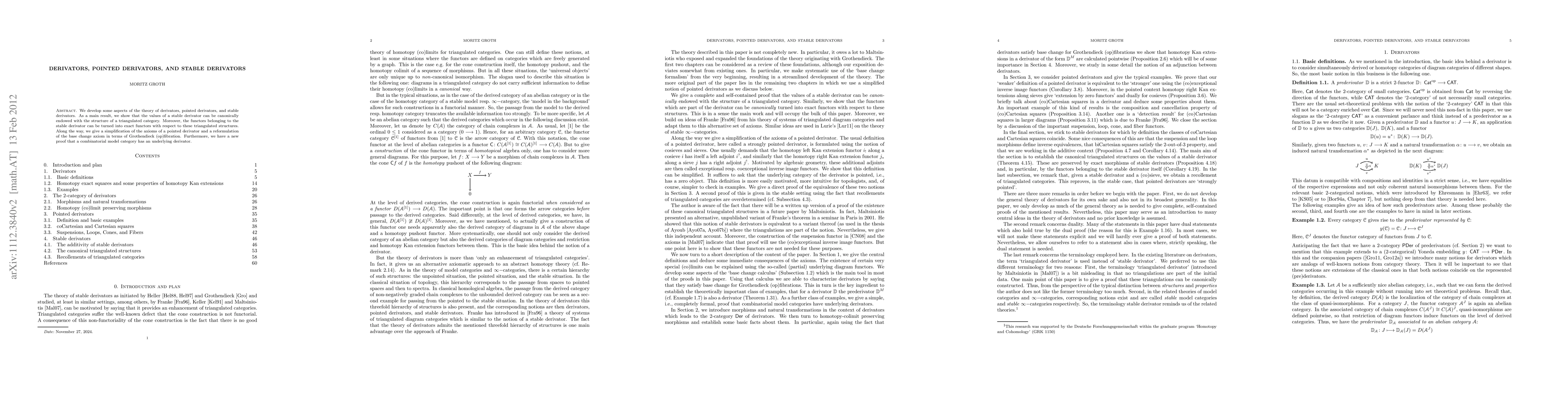 This paper develops the theory of derivators, introducing stable derivators and showing they yield triangulated categories. It simplifies pointed derivator axioms and reformulates the base change axiom using Grothendieck (op)fibrations, while also providing a new proof for the existence of derivators from combinatorial model categories.