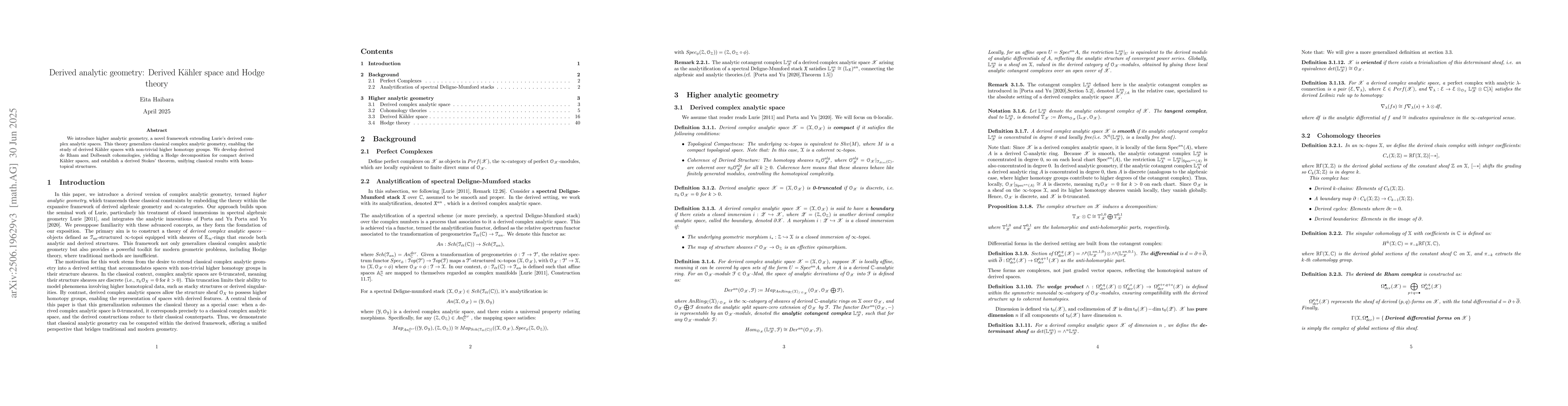 We introduce higher analytic geometry, a novel framework extending Lurie's derived complex analytic spaces. This theory generalizes classical complex analytic geometry, enabling the study of derived K\"ahler spaces with non-trivial higher homotopy groups. We develop derived de Rham and Dolbeault cohomologies, yielding a Hodge decomposition for compact derived K\"ahler spaces, and establish a derived Stokes' theorem, unifying classical results with homotopical structures.