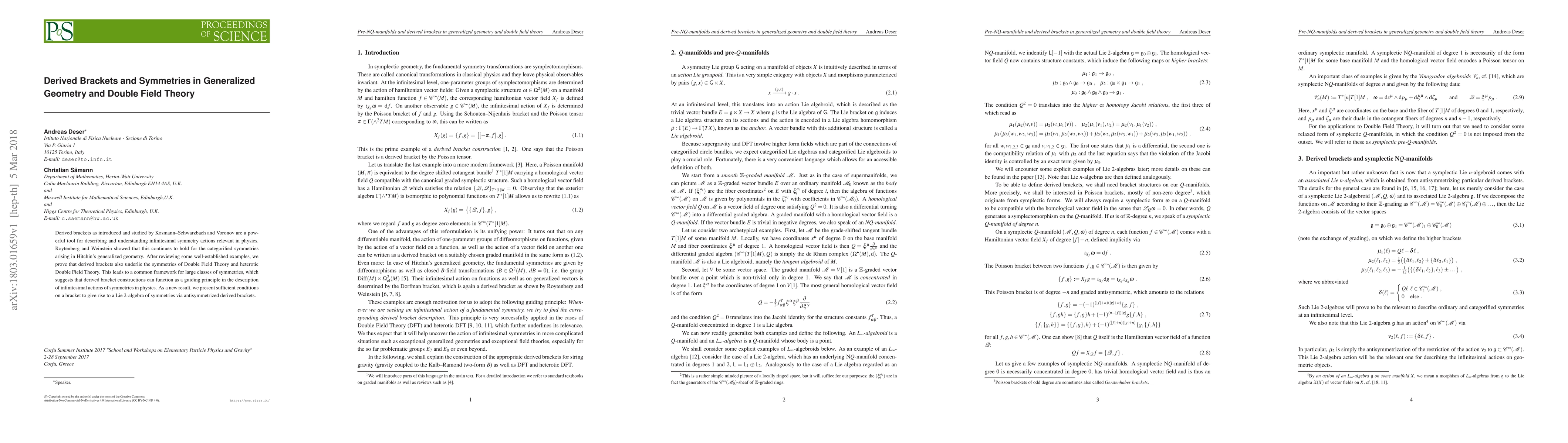 This paper explores the application of derived brackets to describe symmetries in generalized geometry and Double Field Theory, showing they unify various symmetries and propose conditions for forming Lie 2-algebras of symmetries. The findings suggest derived brackets can guide the understanding of infinitesimal symmetry actions in physics.
