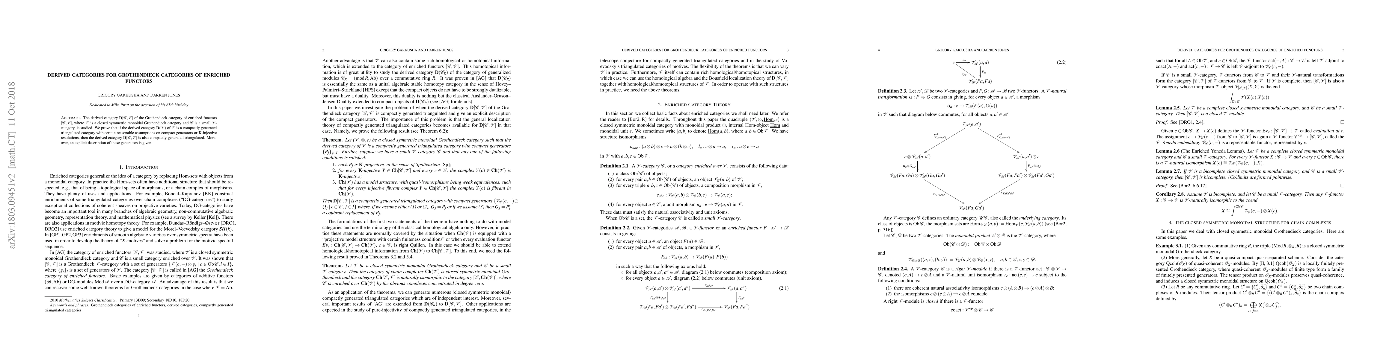 Summary: This paper studies the derived category of enriched functors between a Grothendieck category and a closed symmetric monoidal Grothendieck category. It proves that under certain conditions, the derived category of enriched functors is compactly generated and provides an explicit description of its generators.