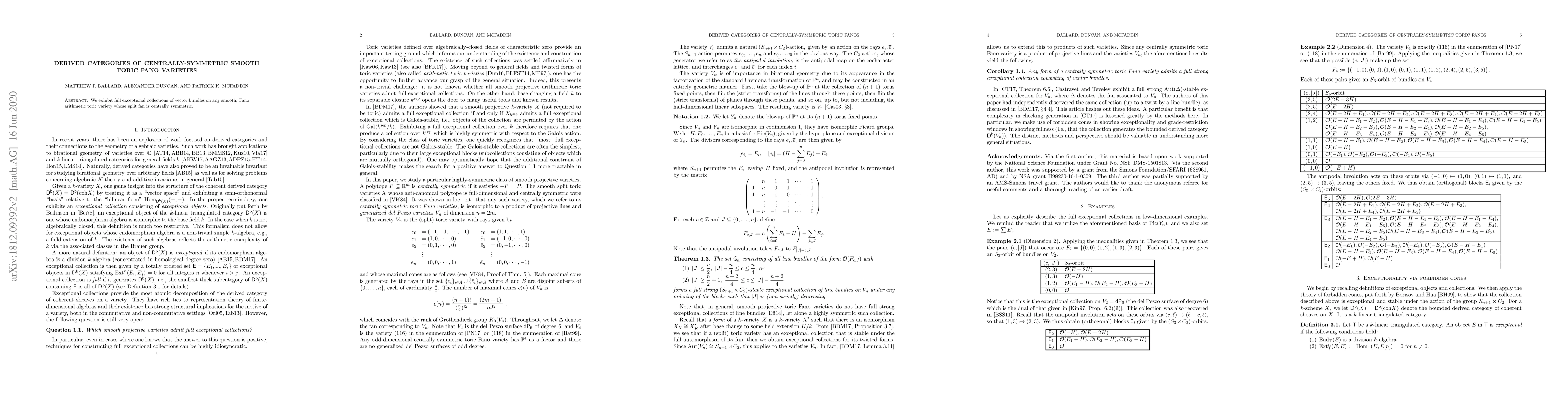 Summary: The paper presents complete exceptional collections of vector bundles for smooth, Fano arithmetic toric varieties with centrally symmetric split fans, providing significant insights into their derived categories. These collections facilitate a deeper understanding of the geometry and cohomology of such varieties.