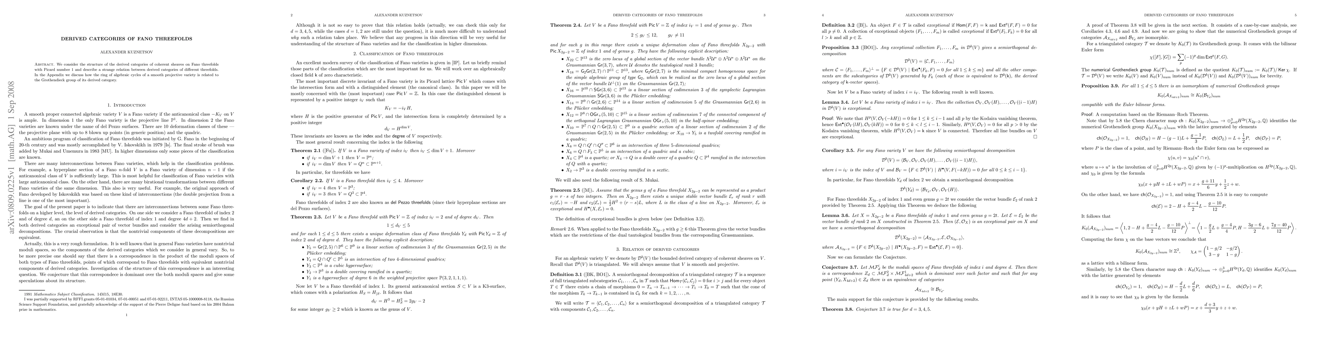 This paper explores the derived categories of coherent sheaves on Fano threefolds with Picard number 1, uncovering a peculiar relationship between derived categories of different threefolds. It also examines the connection between the ring of algebraic cycles and the Grothendieck group of a smooth projective variety's derived category in the Appendix.