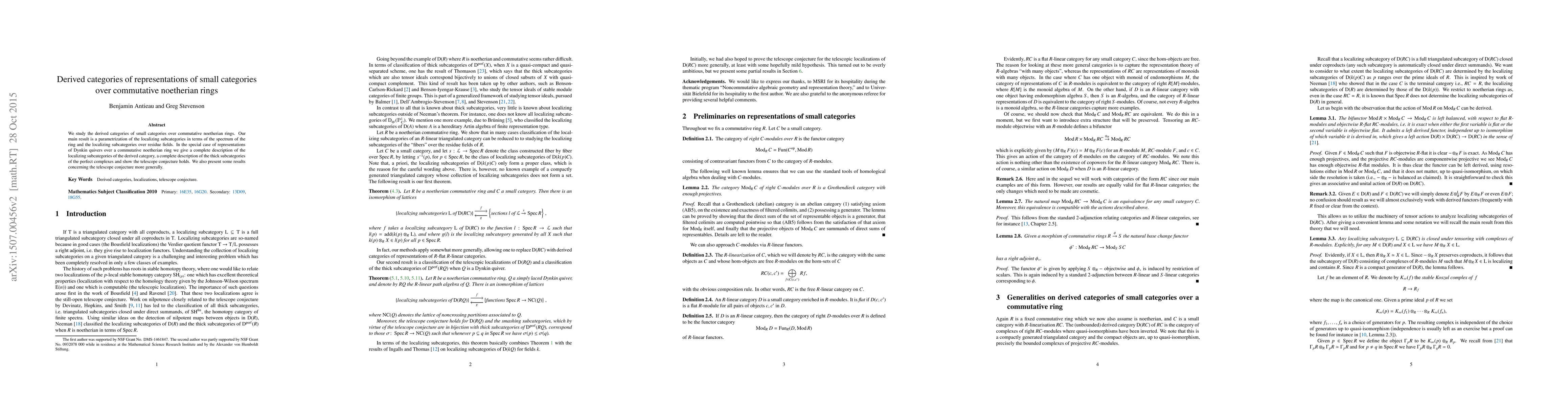 This paper explores the derived categories of small categories over commutative noetherian rings, providing a parametrization of localizing subcategories in terms of the ring's spectrum and residue fields. For Dynkin quivers, it gives a full account of localizing and thick subcategories, confirming the telescope conjecture.